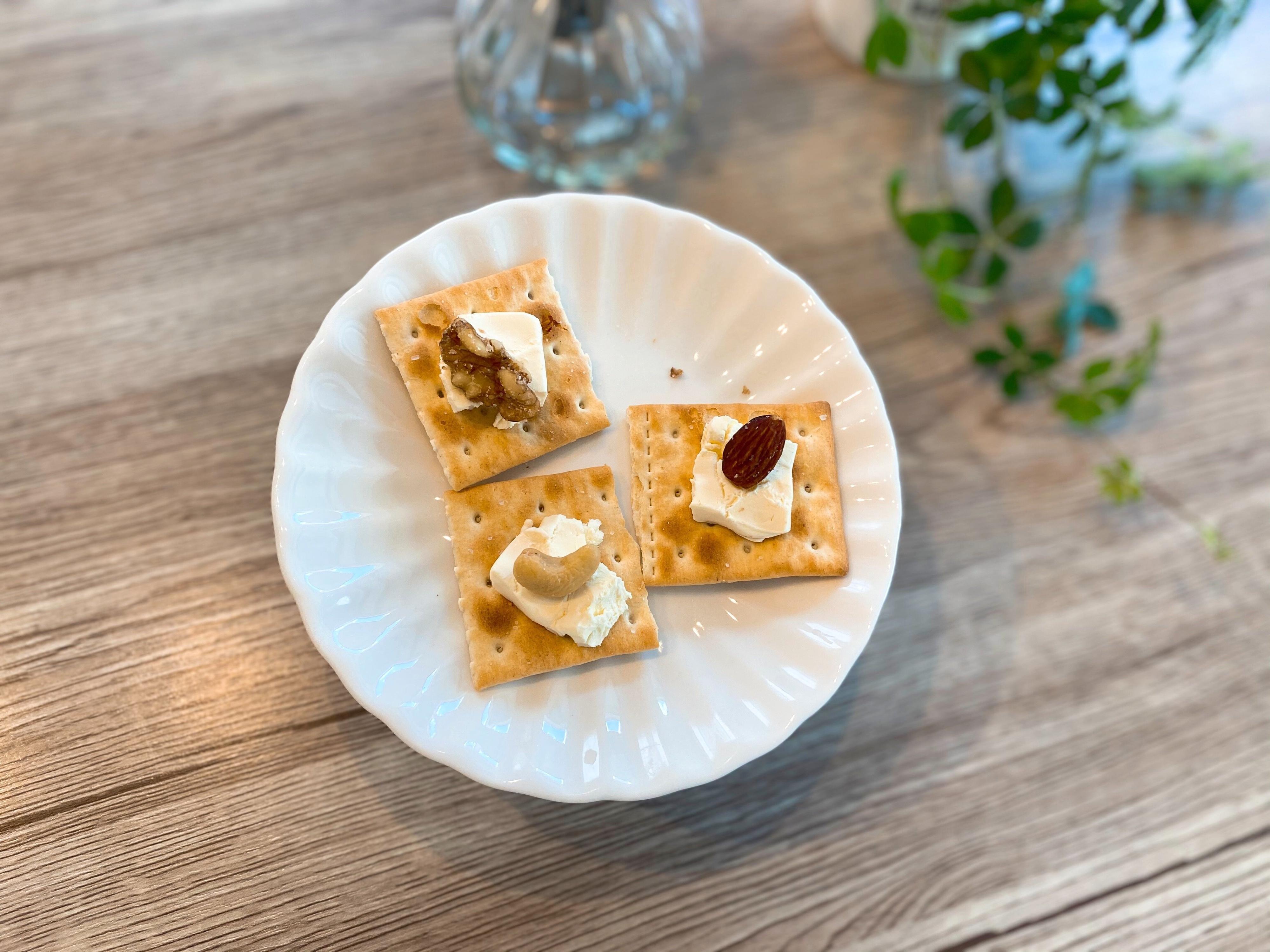 サクサクのクラッカーに濃厚なクリームチーズ、上に「白と黒のトリュフ薫るミックスナッツ」をひとつずつトッピングしました。