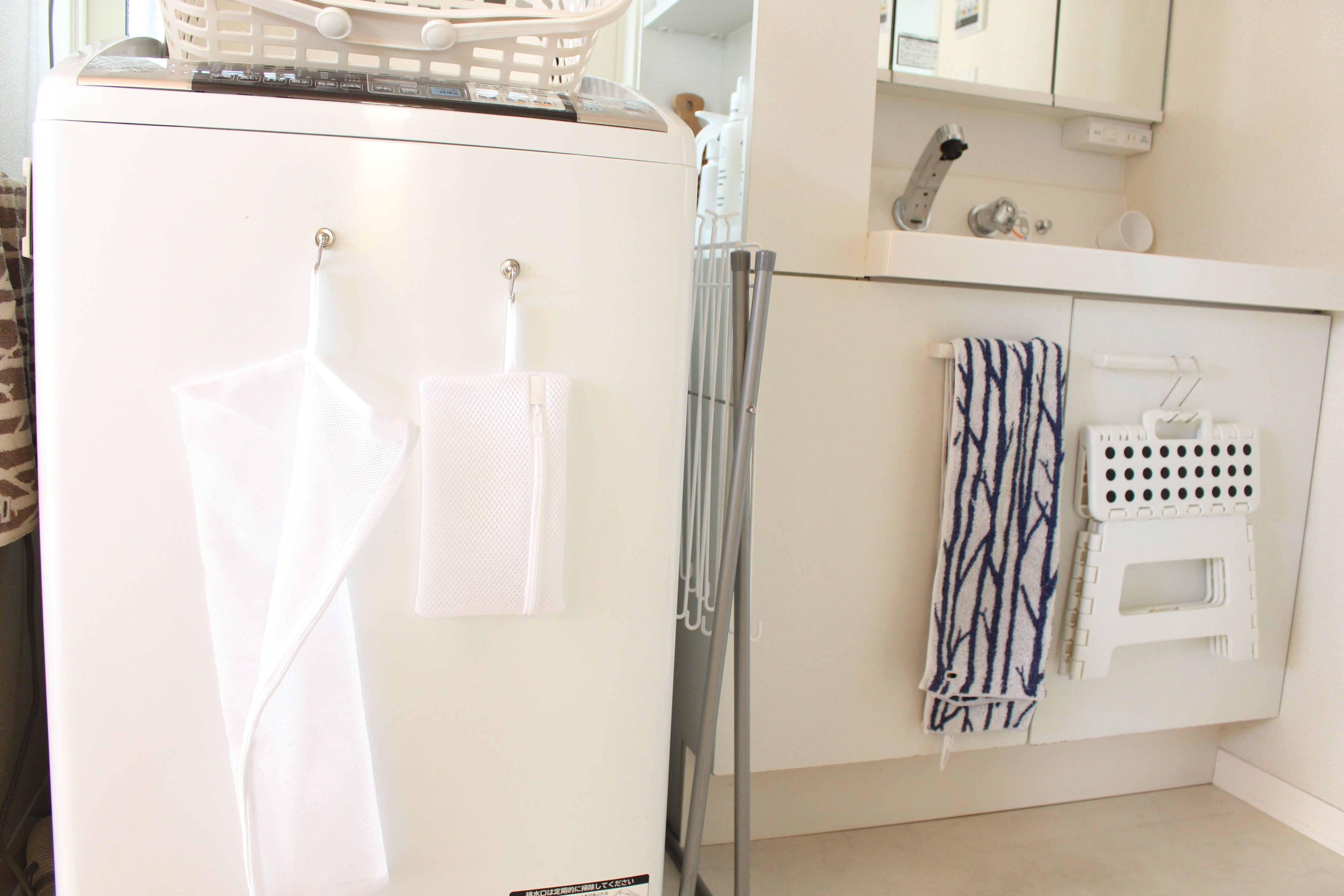 これまた100均アイテムの「マグネットフック」を使って、マスク用の洗濯ネットは洗濯機前にかけて置いています。