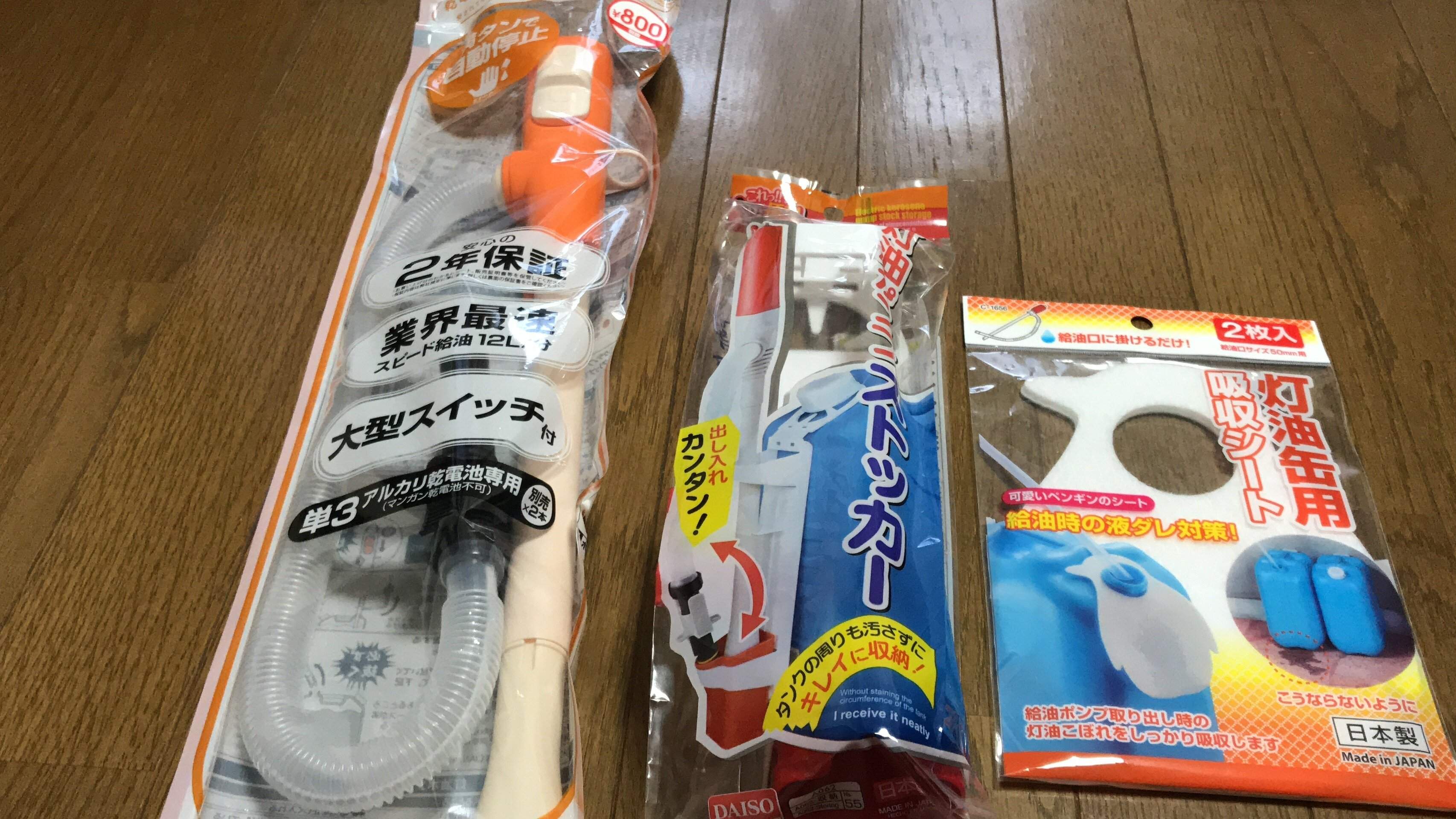 灯油ストーブの関連グッズも購入しました。電動式の灯油ポンプストッカーも1個100円で購入することができました。灯油ポリタンクのキャップを外し、ストッカーを取りつけるだけで、スマートに灯油グッズを収納できます。