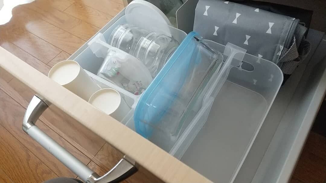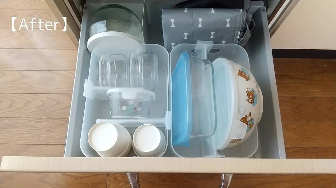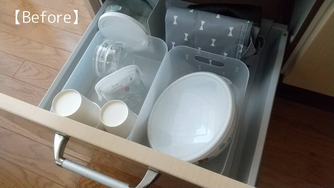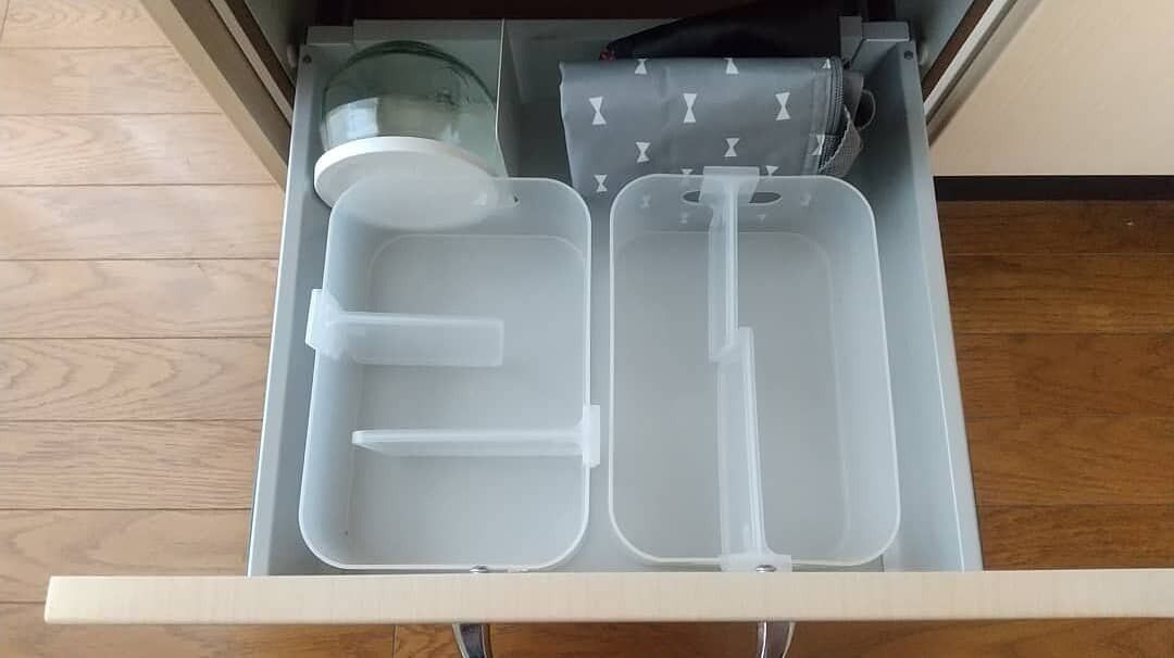 形や大きさがバラバラのモノを収納しているため、ピッタリと仕切ることがむずかしく、半分諦めていました。