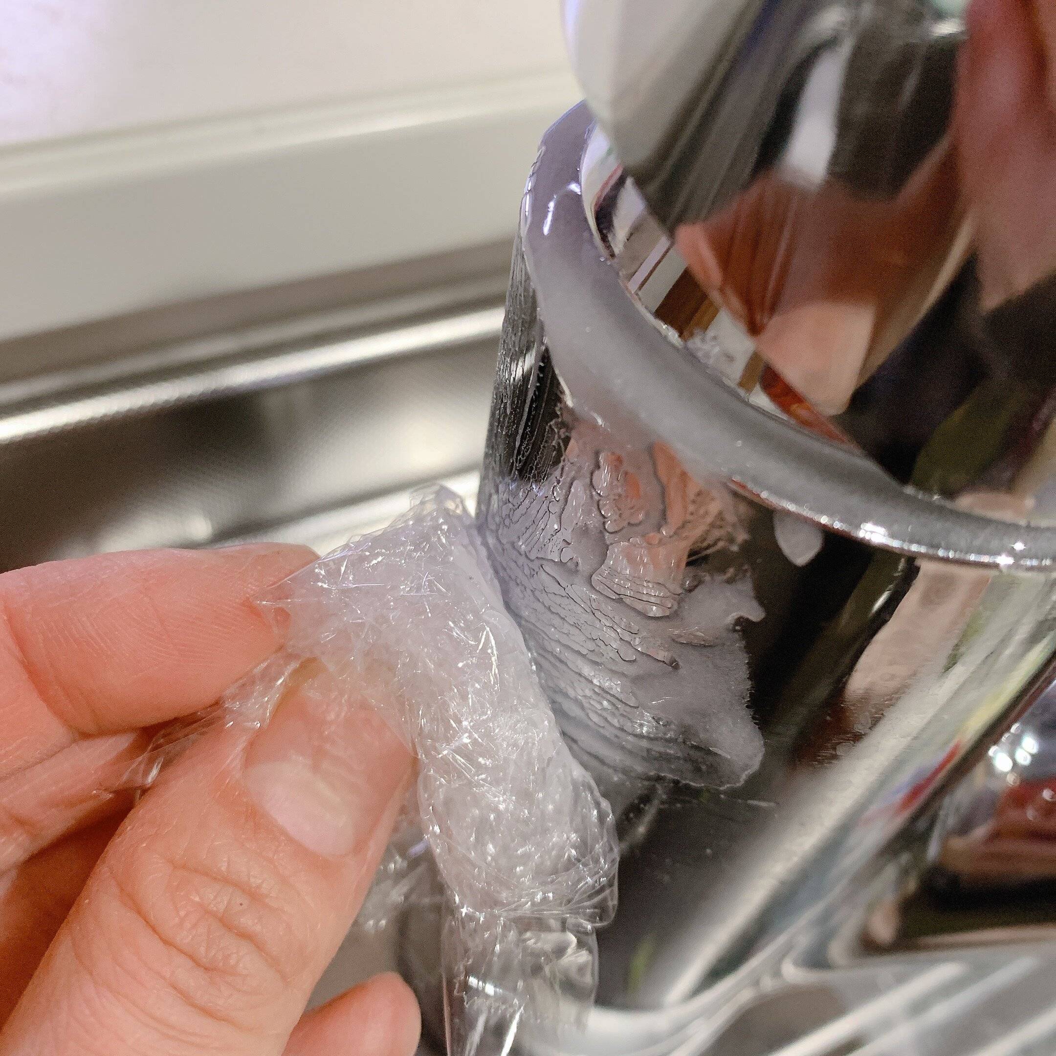 数分後、多く出すぎたジェルが流れてきたので、それを利用してラップを丸めたもので蛇口全体に広げていきます。