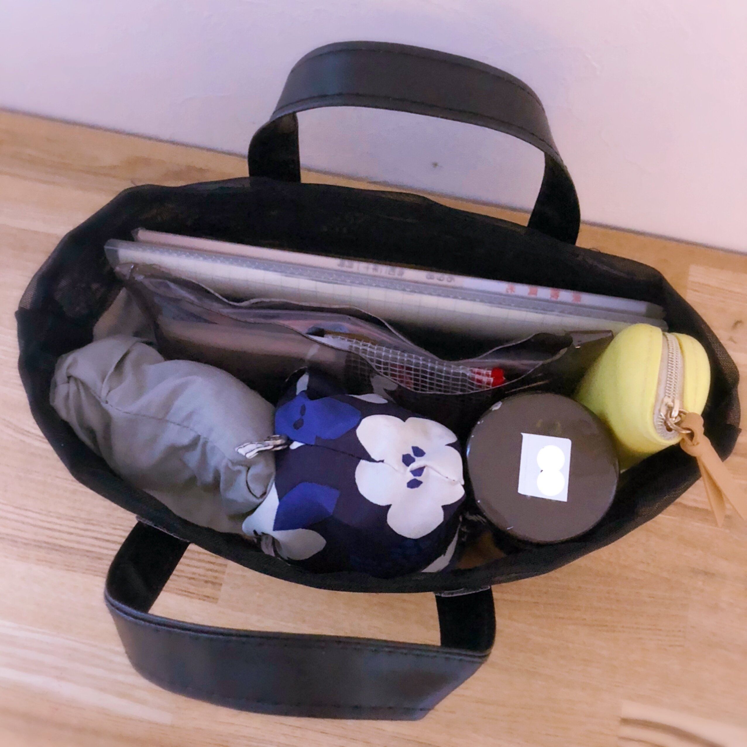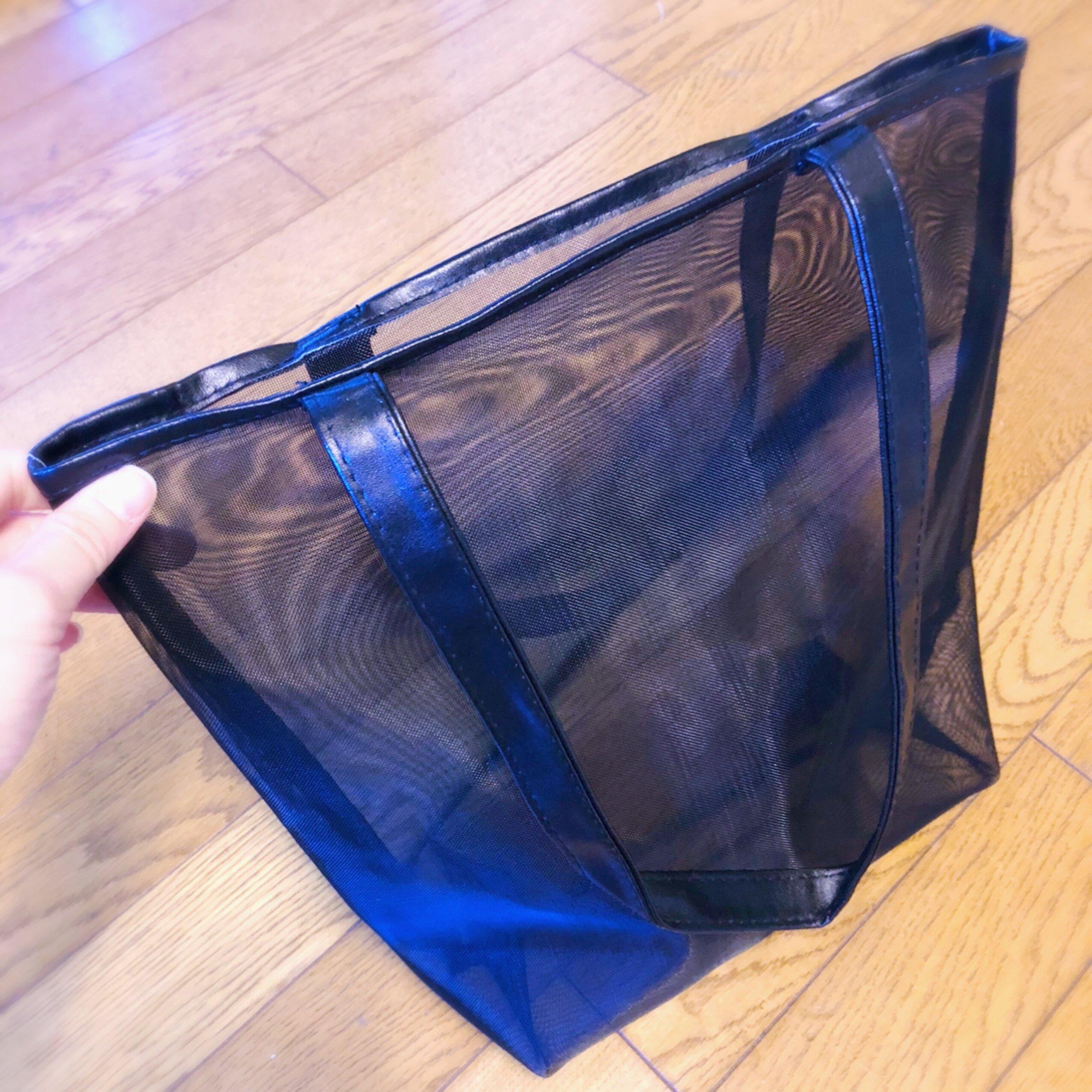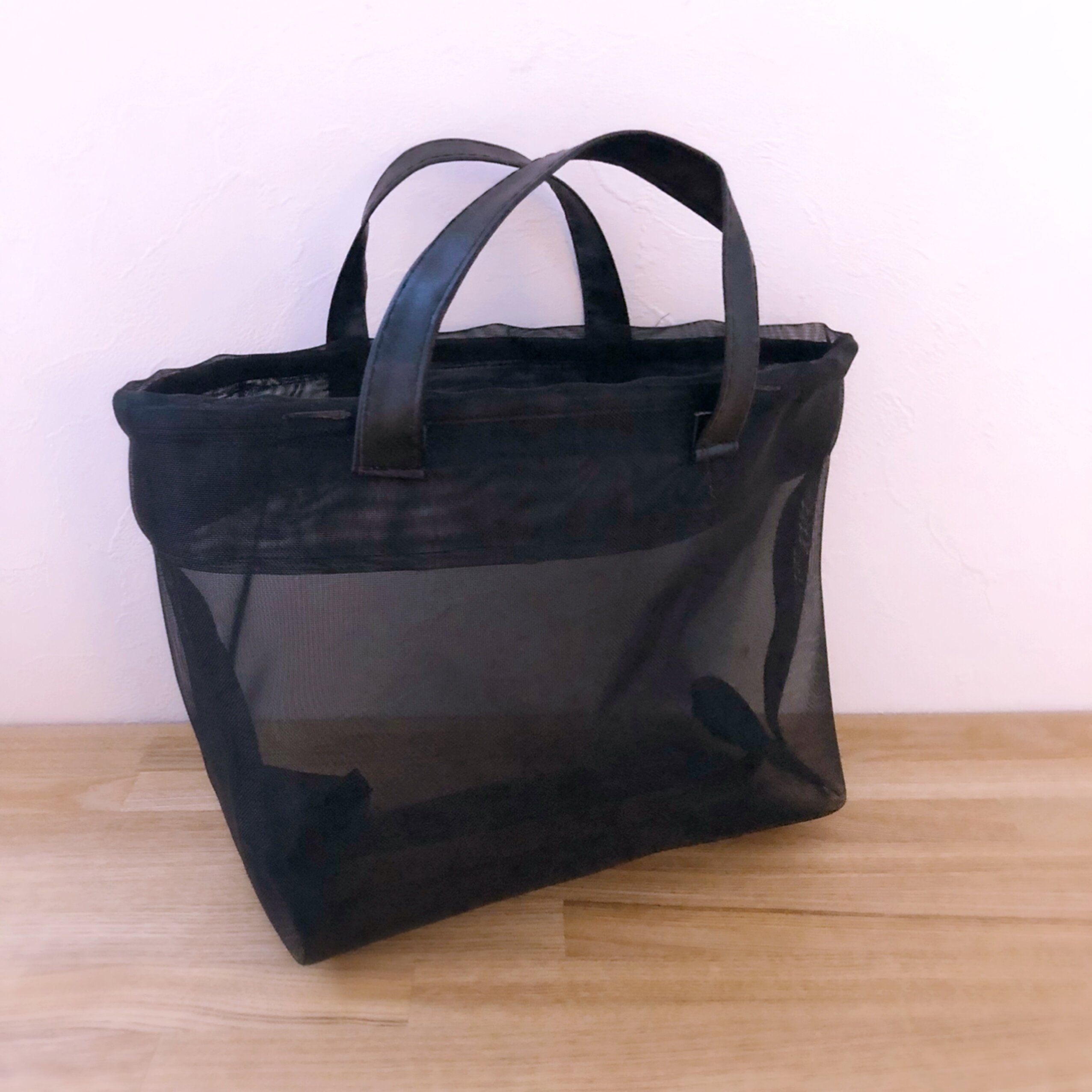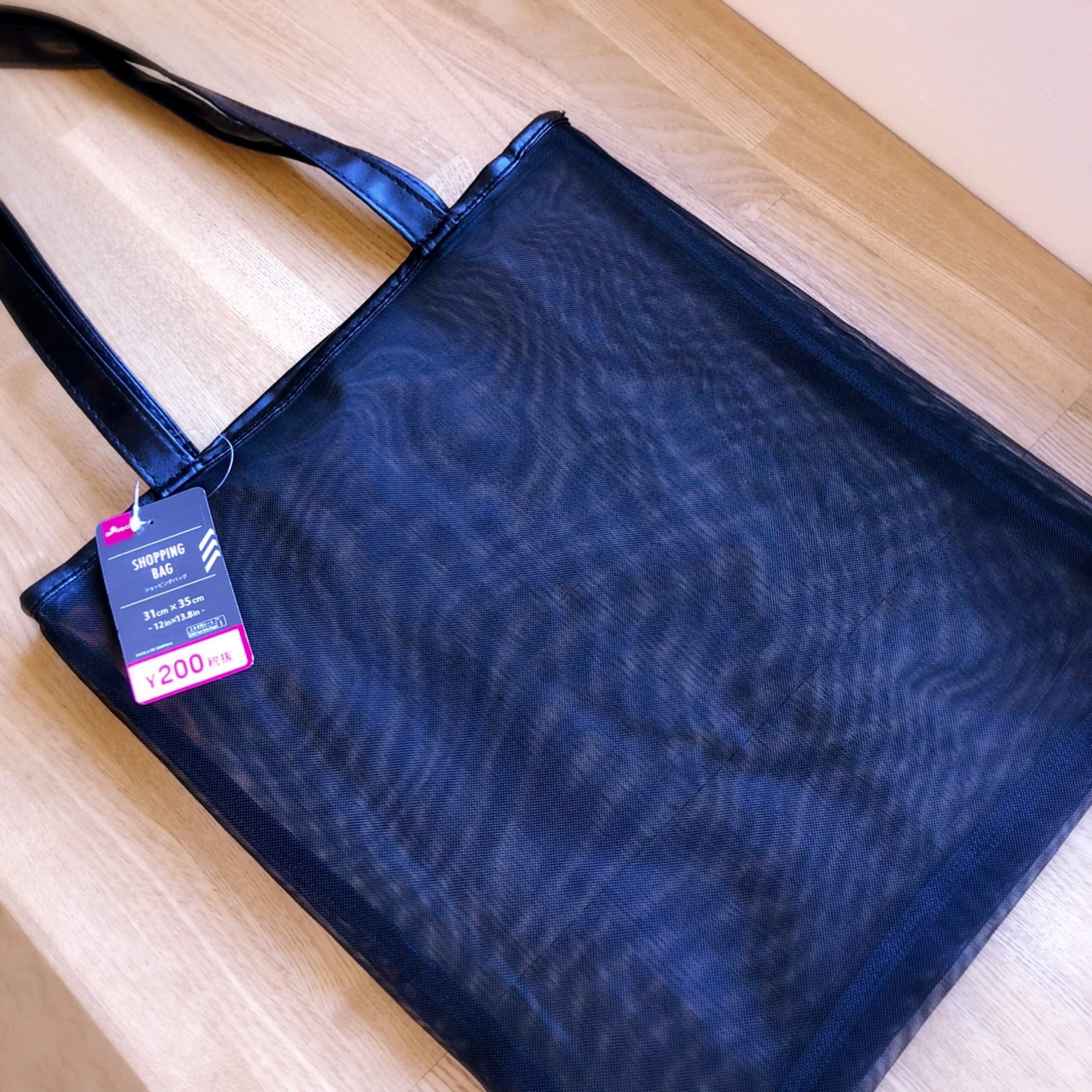 DAISOのマチなしメッシュバッグ、200円商品のものです。シンプルでハリのある素材なので、バッグインバッグに向いています。