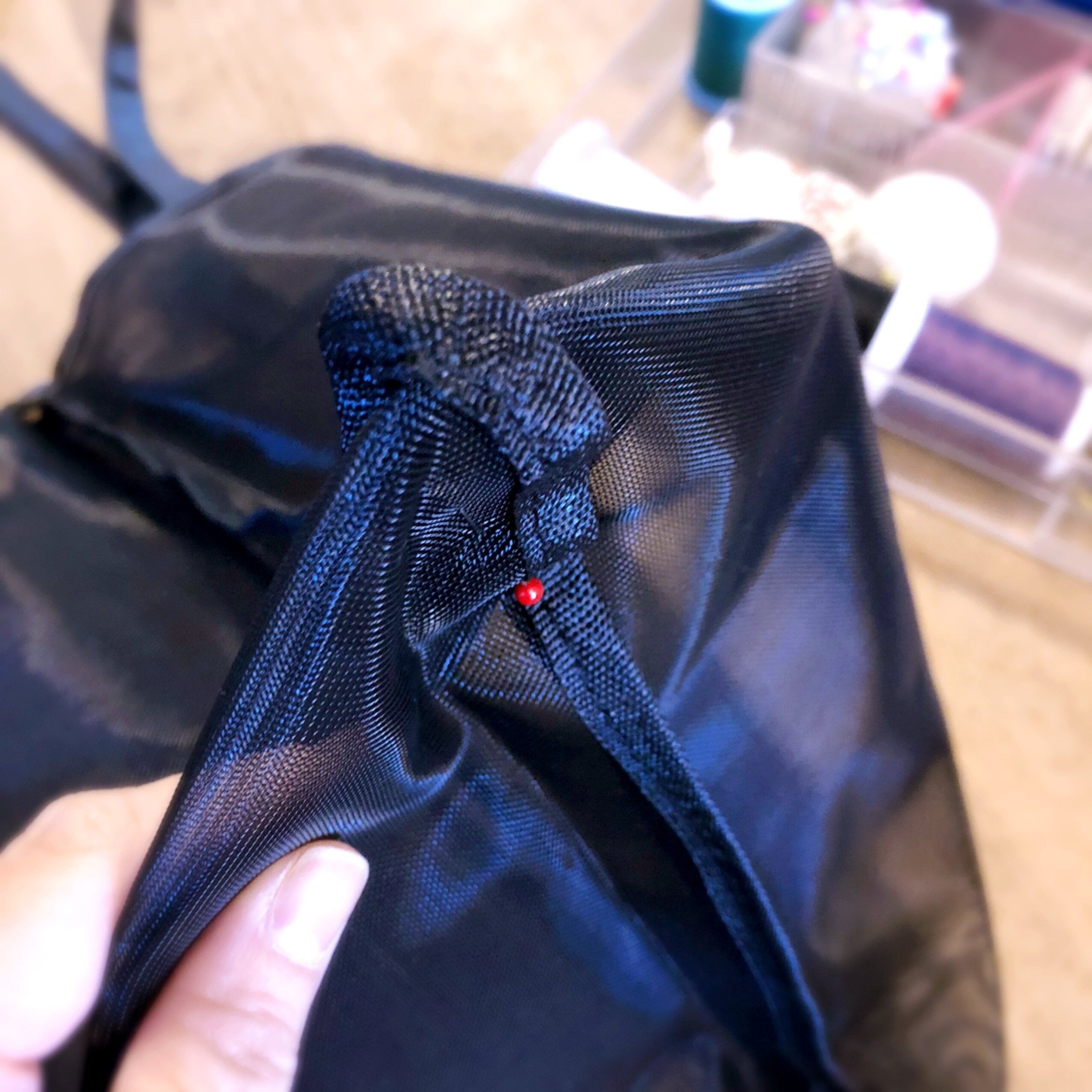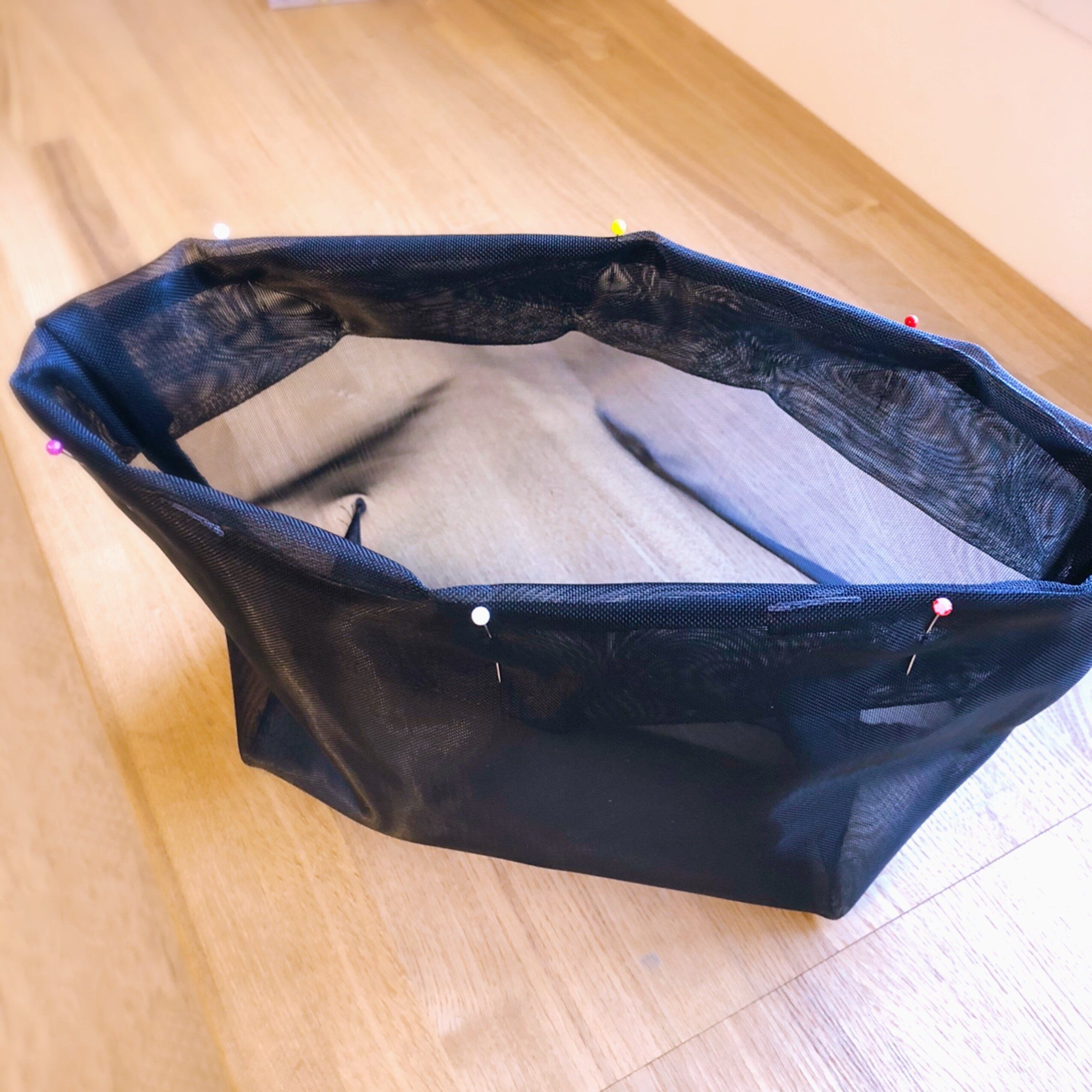 このままでは深すぎて整理しづらいのと、持ち手が長すぎるので、持ち手はカットして好みの高さで二つ折り込みます。折り込みは布を切らずにそのまま折ってしまう方がラクです。