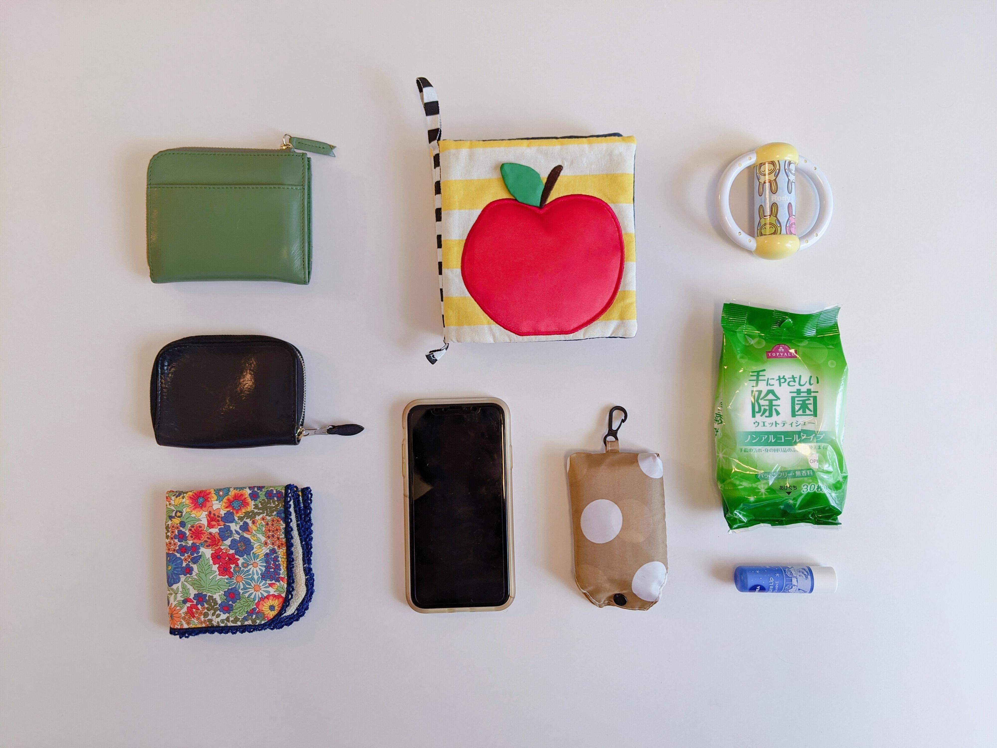 左上から右回りに、財布、おもちゃ(布絵本、ガラガラ)、除菌シート、リップクリーム、エコバッグ、スマホ、ハンカチ、キーケース。