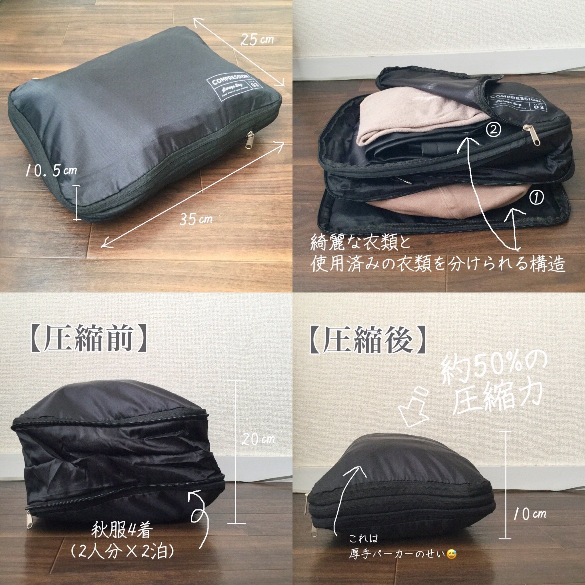 約50%の圧縮力があり衣類がとてもコンパクトに収まりました。