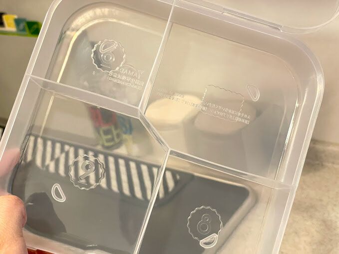 忙しい朝にすぐに取り出せるように、適当なサイズのセリアのケースにおかずカップをまとめて収納していました。入れすぎで蓋がカチッと閉まらず。