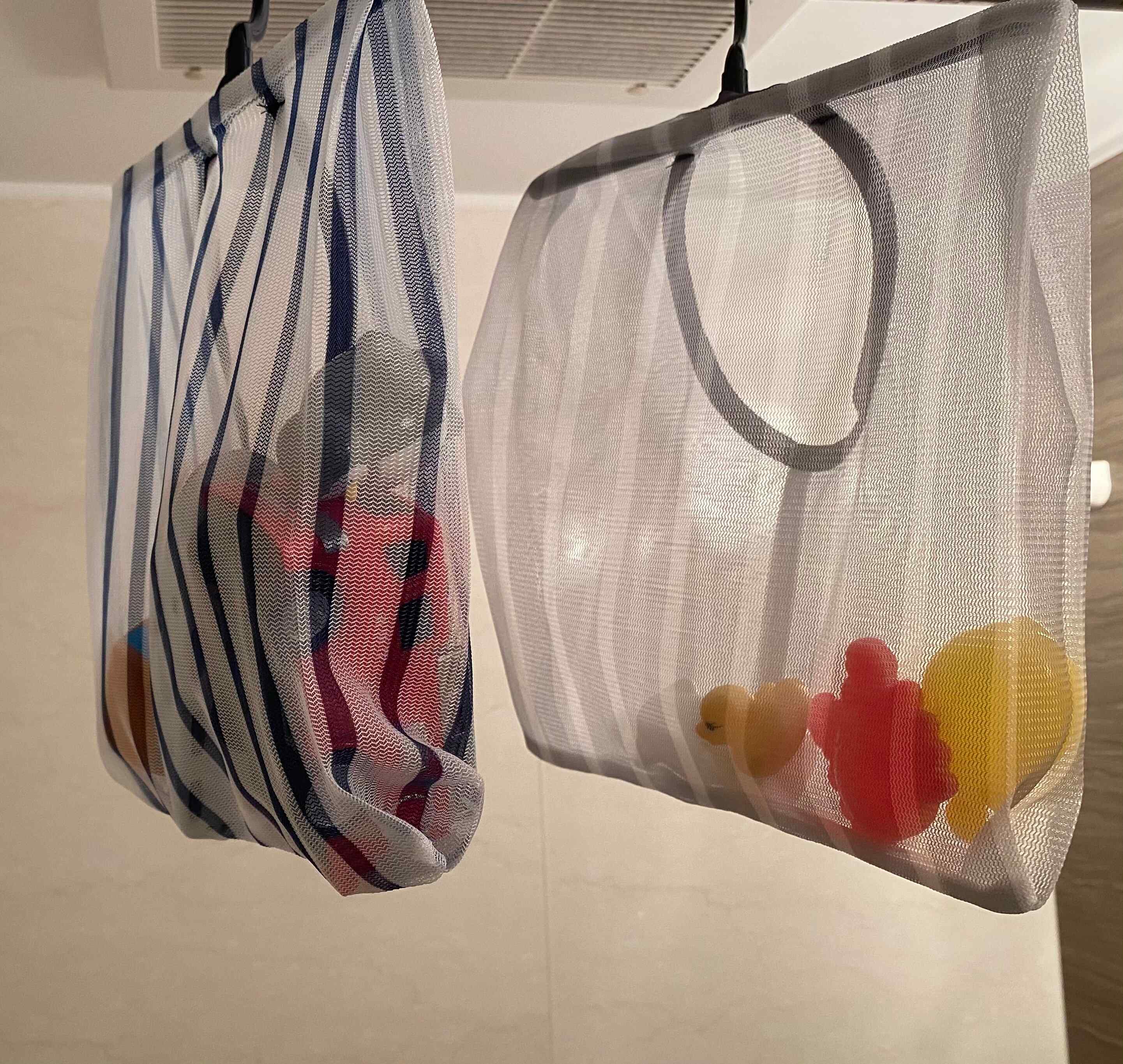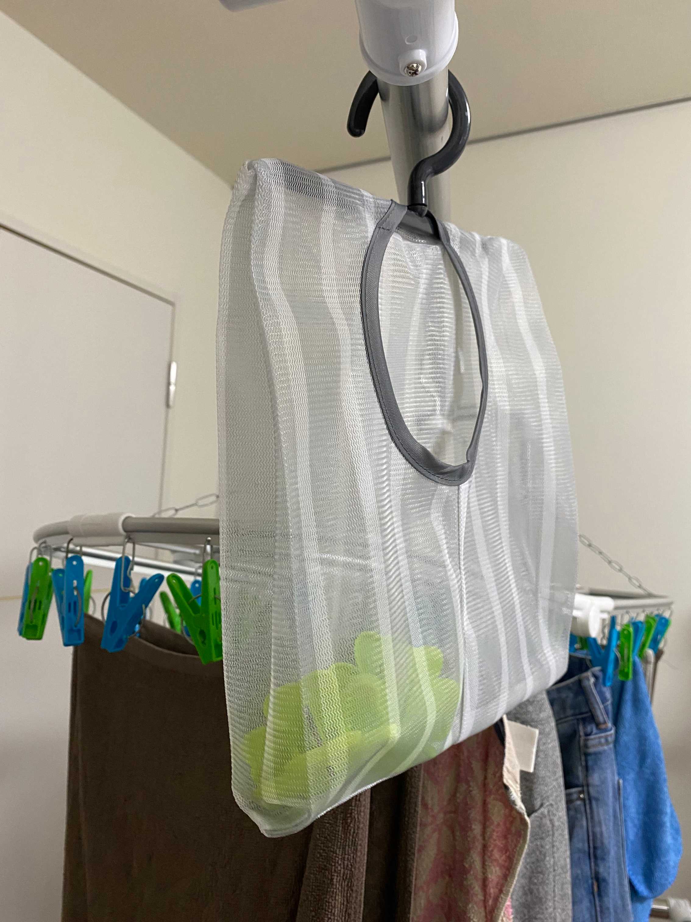 収納に困っていましたが、こちらのネットを浴室乾燥用の物干し竿につるすと、空中収納が可能に!ネットなのである程度ぬれていてもそのまま収納でき、高さがある場所なので邪魔にもなりません。