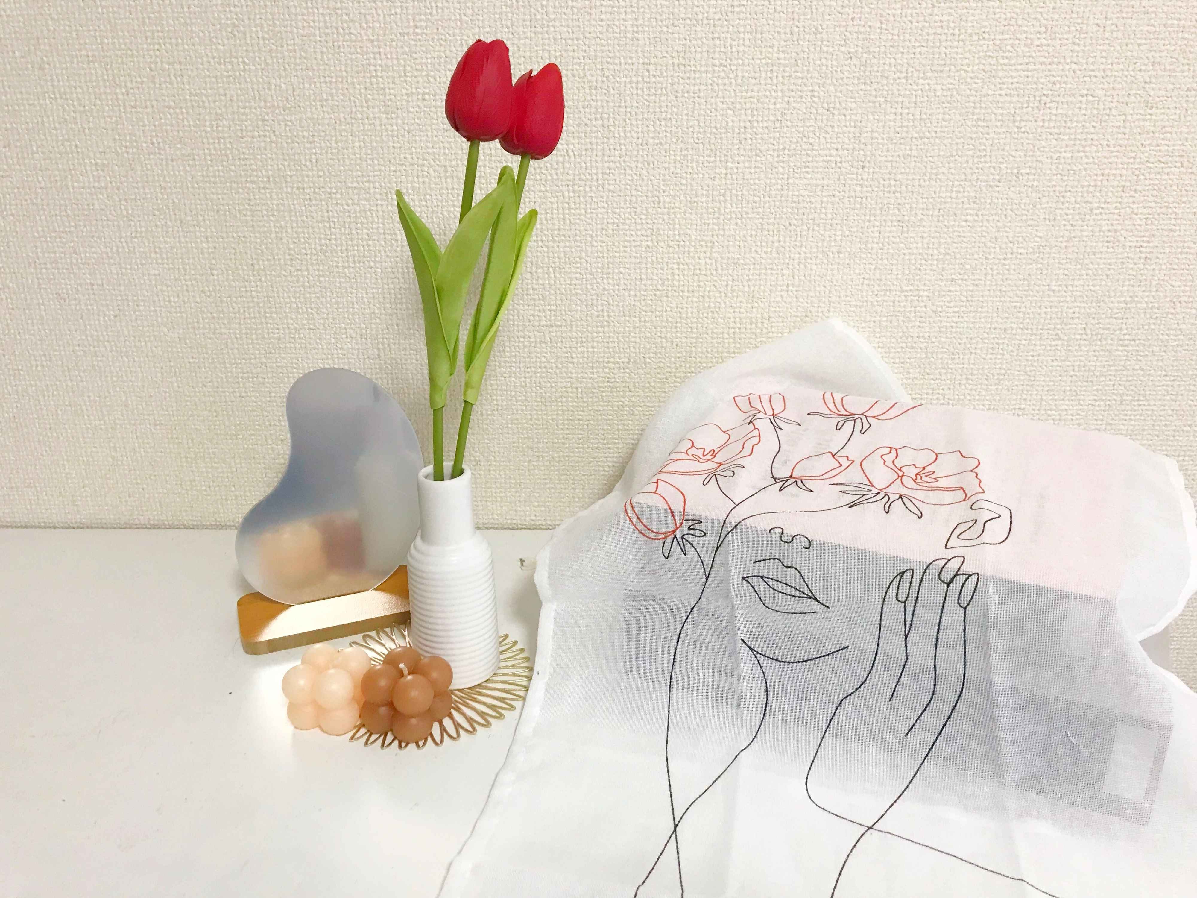 キッチン雑貨コーナーで販売されている「ソフトコースターフラワー2P」(110円)はコップのコースターとしてはもちろん、インテリアアイテムとしても優秀です。キャンドルやフラワーベース・ディフューザーなど下に敷いて使うと一気におしゃれ感が増します。