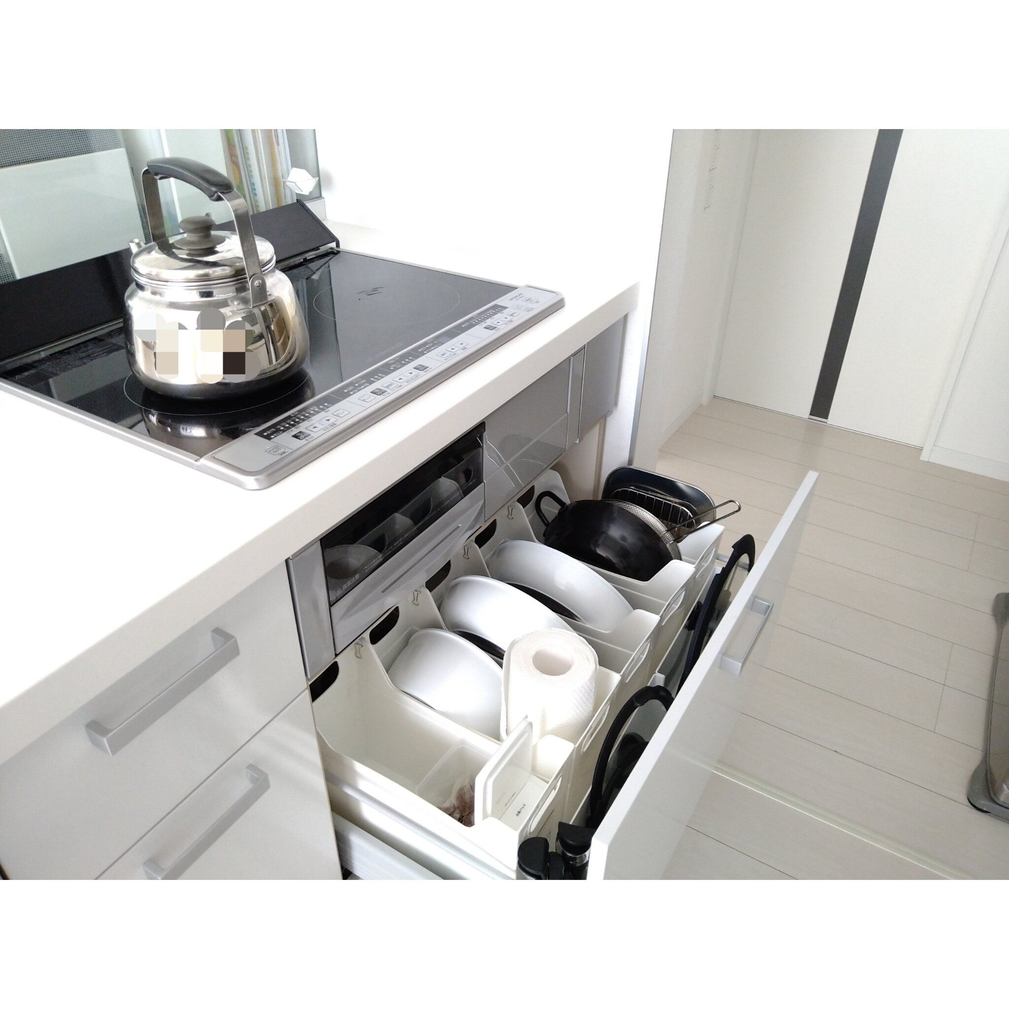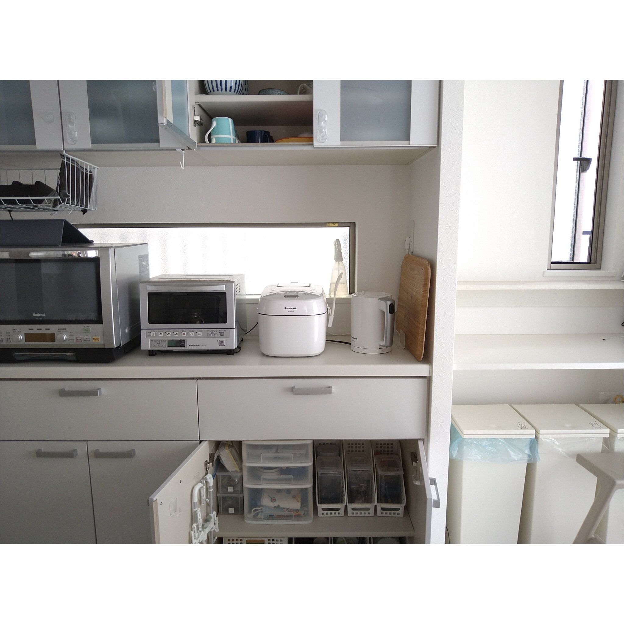 こちらも動線を考えて、カップボードのマグカップとポットの近くに収納しています。
