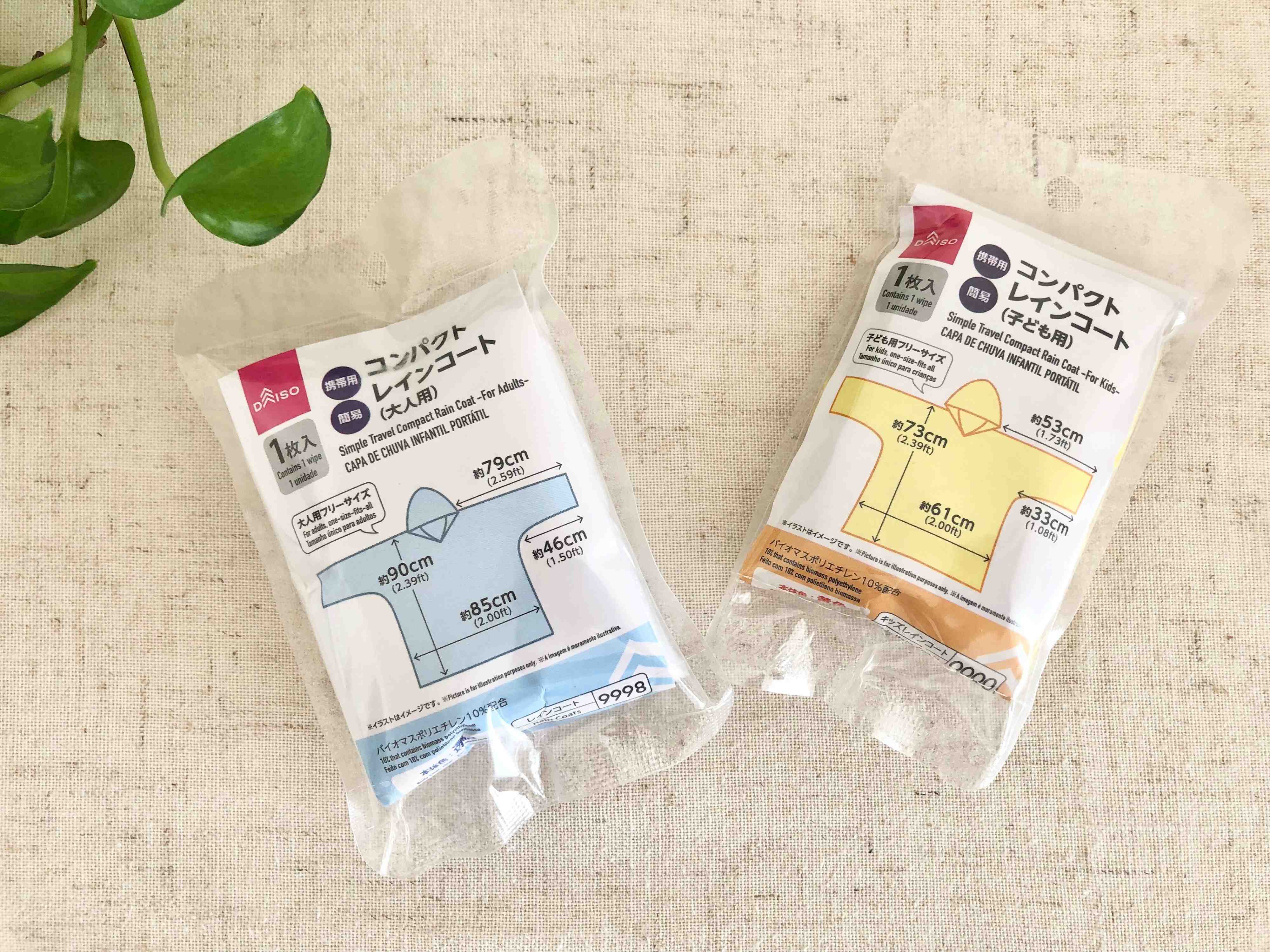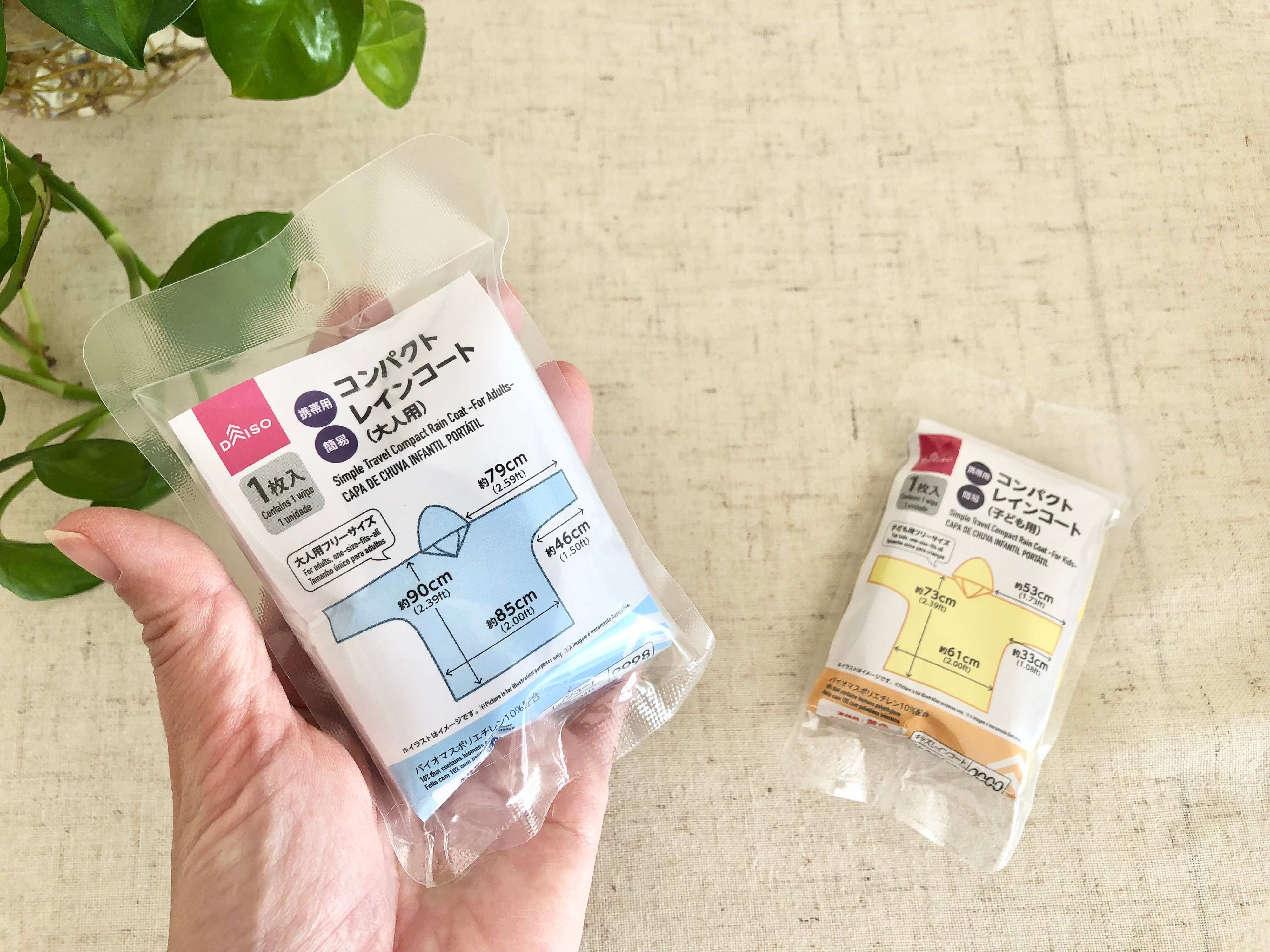 ご紹介するのは、ダイソーの「コンパクトレインコート」という商品です。大人用と子ども用があり、それぞれ110円で販売されています。
