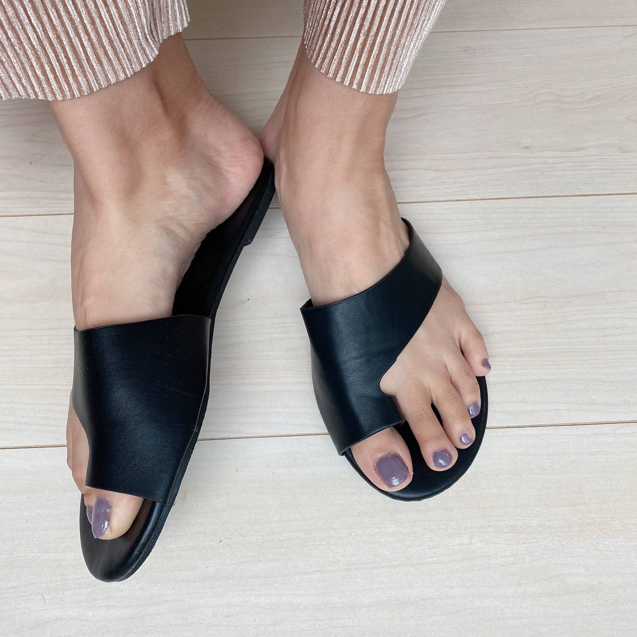 ダイソーで発見したのは今年トレンドの形の「レザー風フラットアシメサンダル」!価格はなんと330円税込とかなりのプチプラです。サイズは23~24.5cmのワンサイズでしたが、サンダルなので0.5cmくらいの違いならはけそうなデザインでした。カラバリは、ブラック、アイボリー、ブラウンの3色展開でした。昨年もダイソーで330円のサンダルが出た!と話題でしたが、今年はトレンドのトングサンダルのデザインになっていてSNSなどでも話題です。
