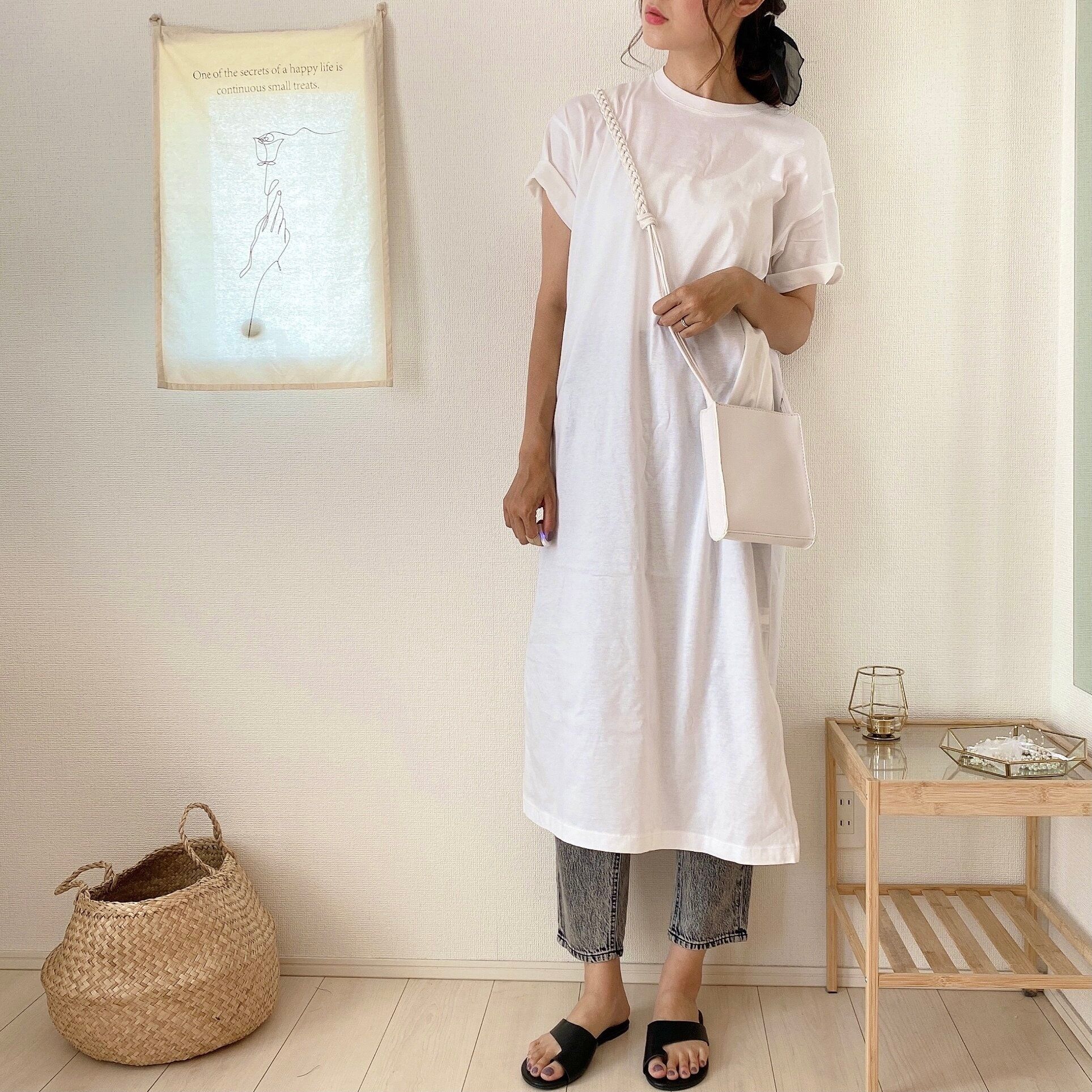 ロング丈のTシャツワンピースとデニムのカジュアルコーデにあわせてみました♡トングサンダルなので肌の露出する面積が多いため、足元に抜け感が出来て夏コーデもさらに爽やかな印象になります!またトングサンダルを合わせるだけで一気に今年らしい印象になるのも嬉しいポイントです!