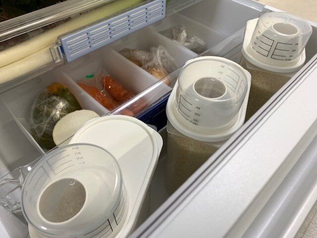 手前は廃版になった無印良品のお米保存容器が3つ並んでいます。