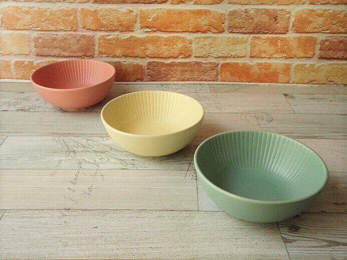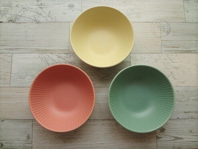 ダスティカラーのプレートとボウルです。流行のくすみカラーで、色はピンク、ブルー、イエローの3色ありました。マットな質感がとてもオシャレ。