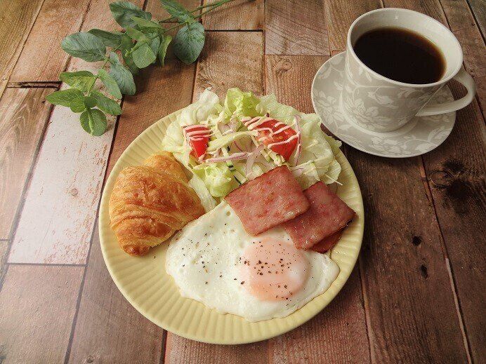 Lサイズの直径は19cmくらい。食パンをのせてみると、お皿の模様の内側にちょうどのる大きさでした。早速盛りつけるとこんな感じになりました。