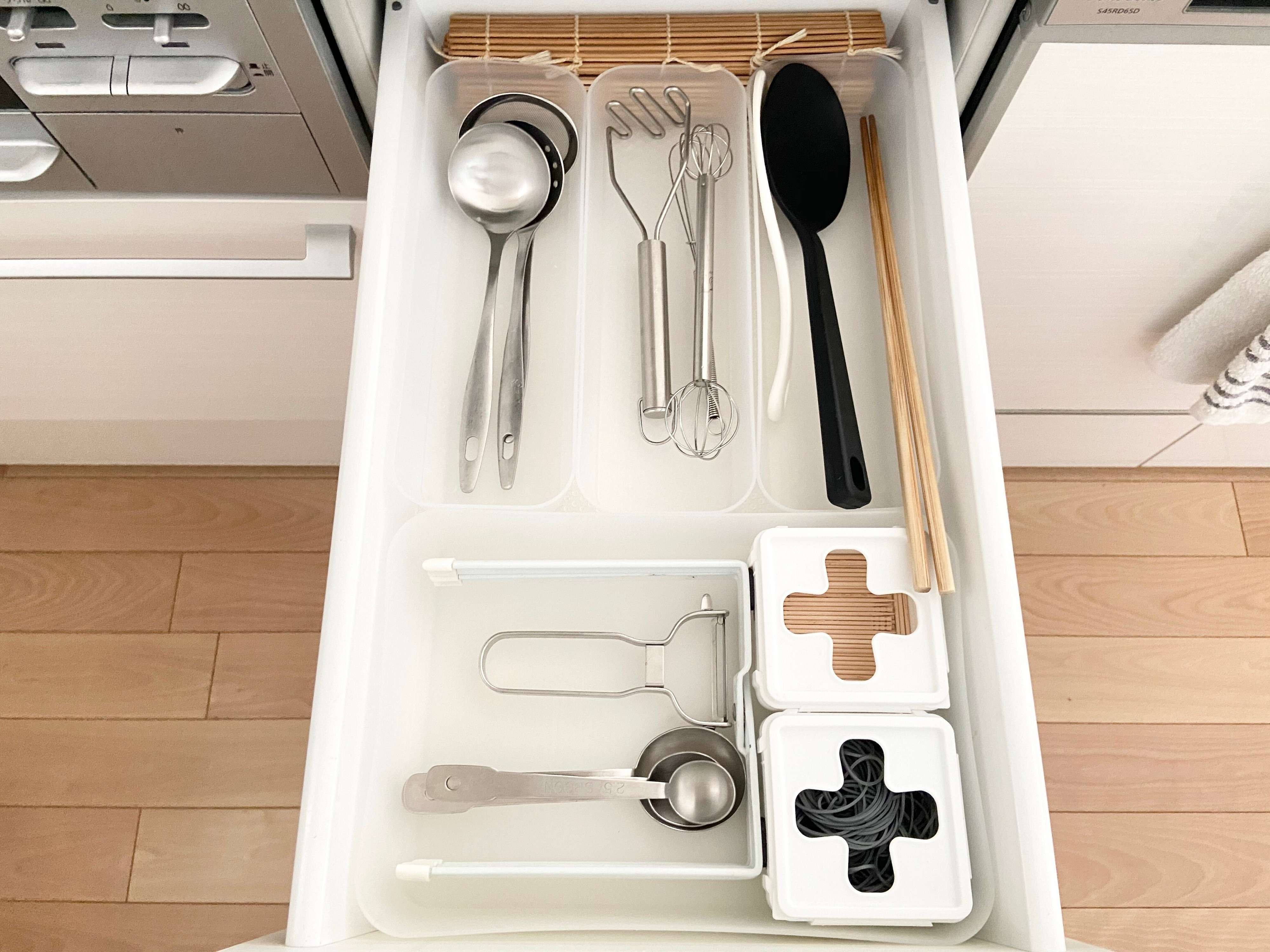 カラーも半透明で清潔感があるのでお気に入り。カラトリー収納は専用のトレーを使っていますが、セリアの整理トレーでそろえておけばよかったと思っているほど(笑)