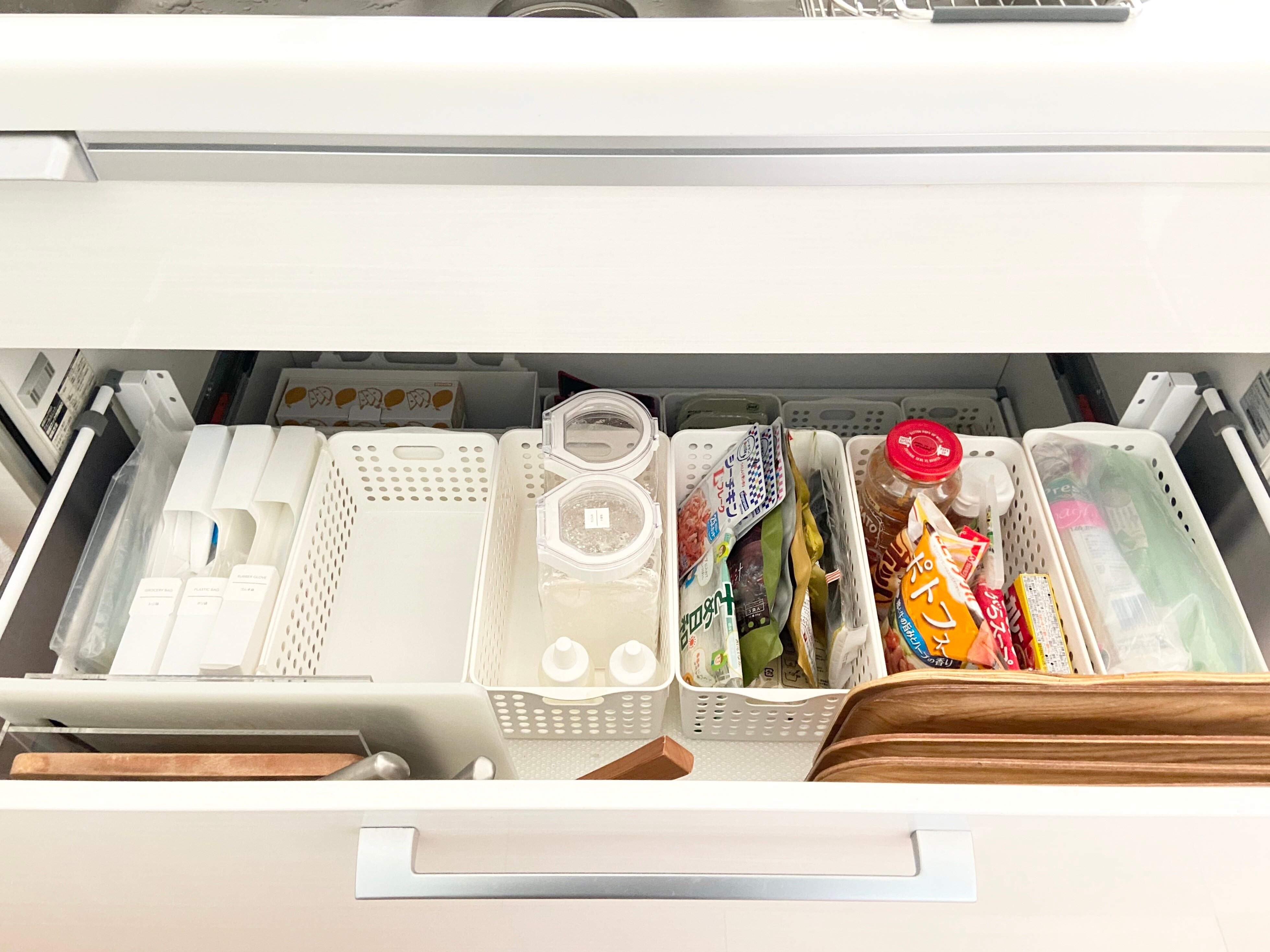 わが家のキッチンでは主に、食品のストック入れとして引き出し収納に10個使っています。