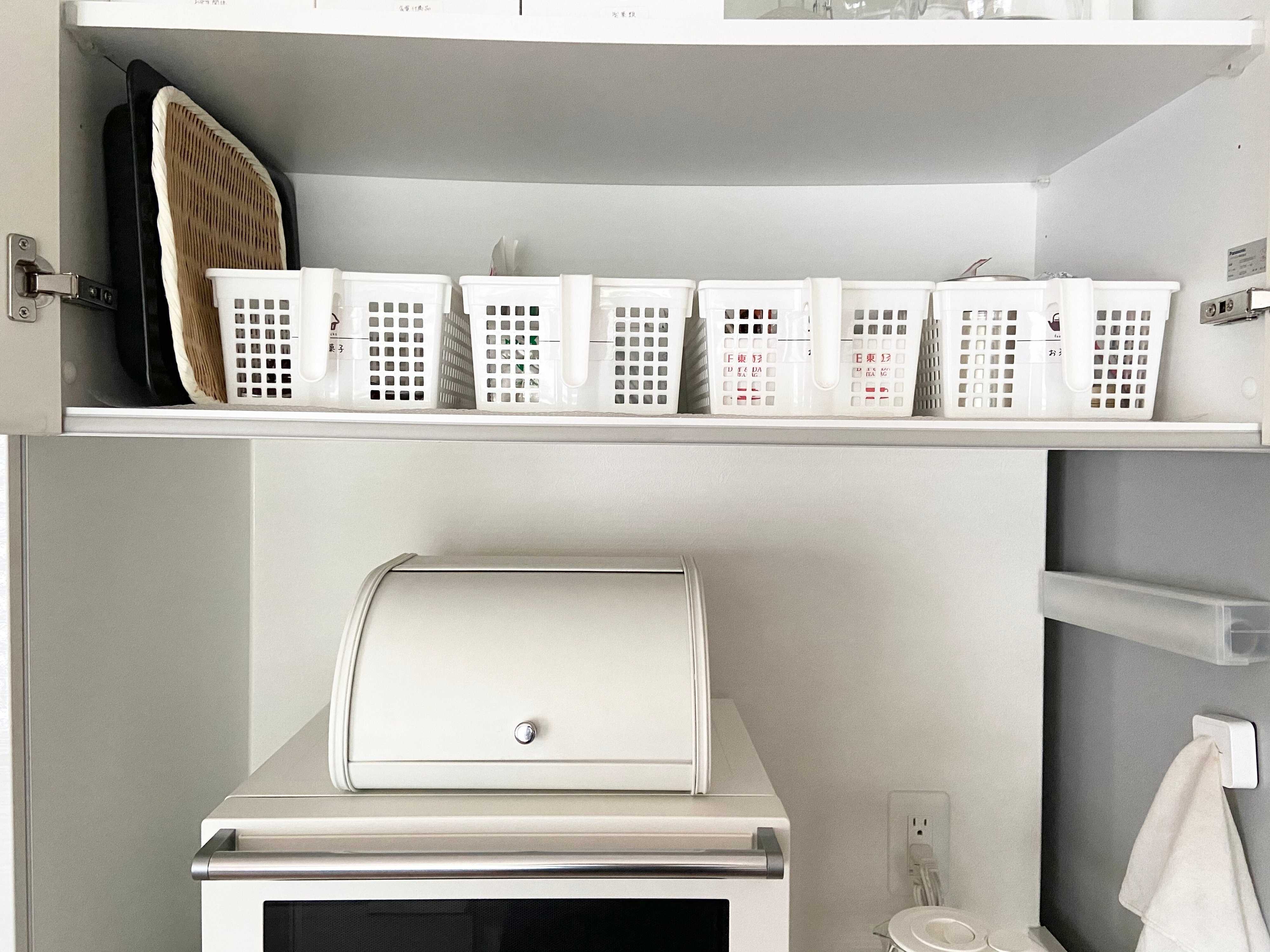お茶のセット、薬のセット、お菓子のセットとグループ分けして吊戸棚収納に4個使っています。