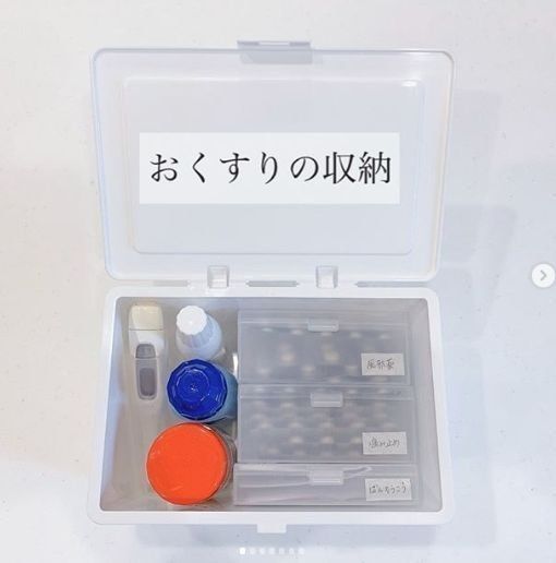 お薬箱はどうしてもごちゃごちゃしてしまいがちですが、大小のさまざまなサイズのクリアケースを活用すれば、見やすく整頓することができます。飲み間違えがないように、なんのくするかラベリングをしておけば誰でもわかりやすいですね。なくなった時もすぐに補充できるので、お薬箱に見やすさはとても大切です。