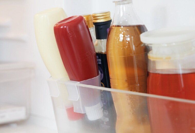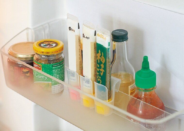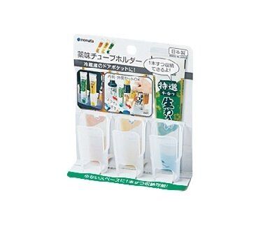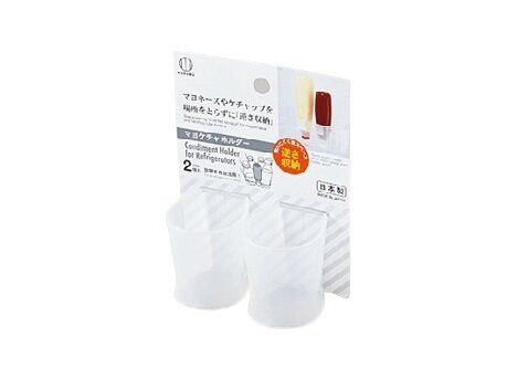 倒れる&場所を取るマヨネーズやケチャップを、逆さにしてスリムに収納。ドアポケットに引っ掛けるフックつきで、安定感◎。