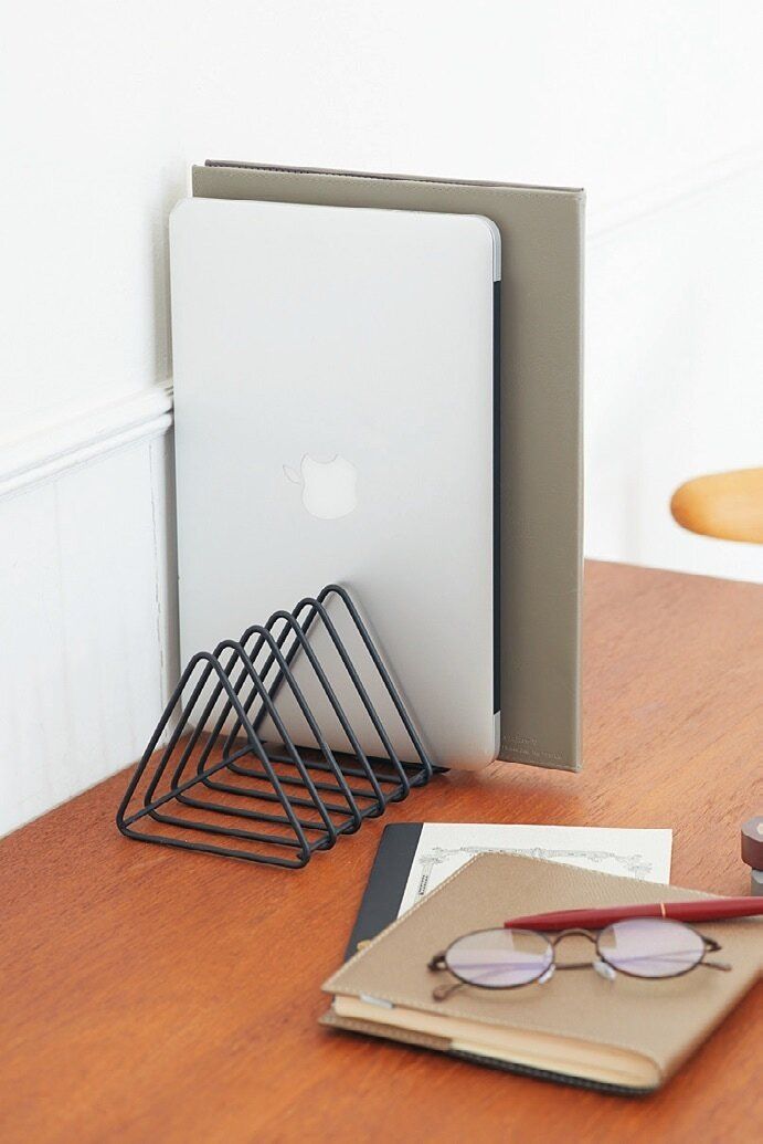 ユニークな三角形のスタンドは、仕切りが7つ分も!本やノートはもちろん、PCの一時保管にも。立てる収納で、ワークスペースがすっきり。