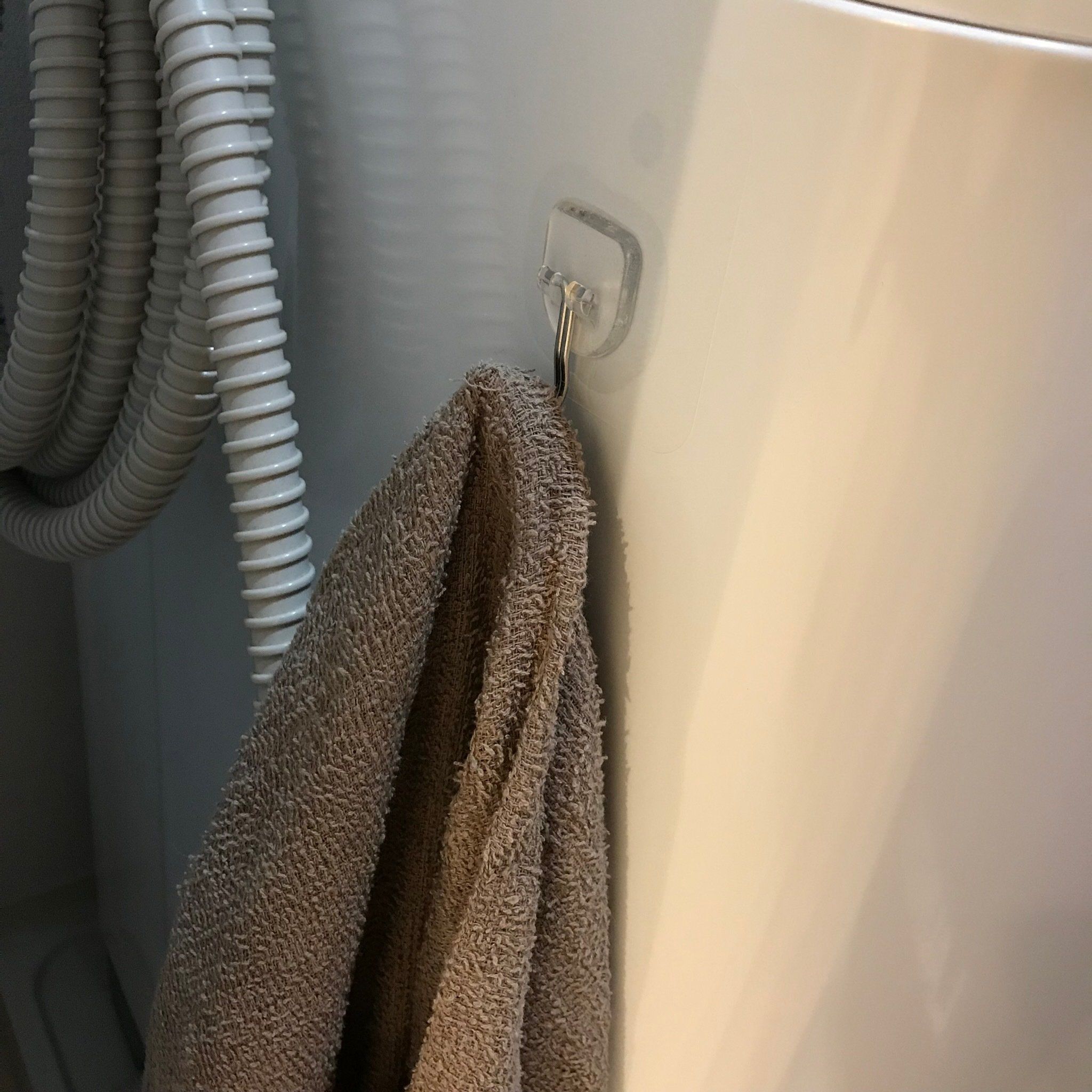 以前住んでいたアパートでは吊るすスペースがなかったので、洗濯機横にセリアで購入した【貼って剥がせるフック】をつけて吊るしていました。