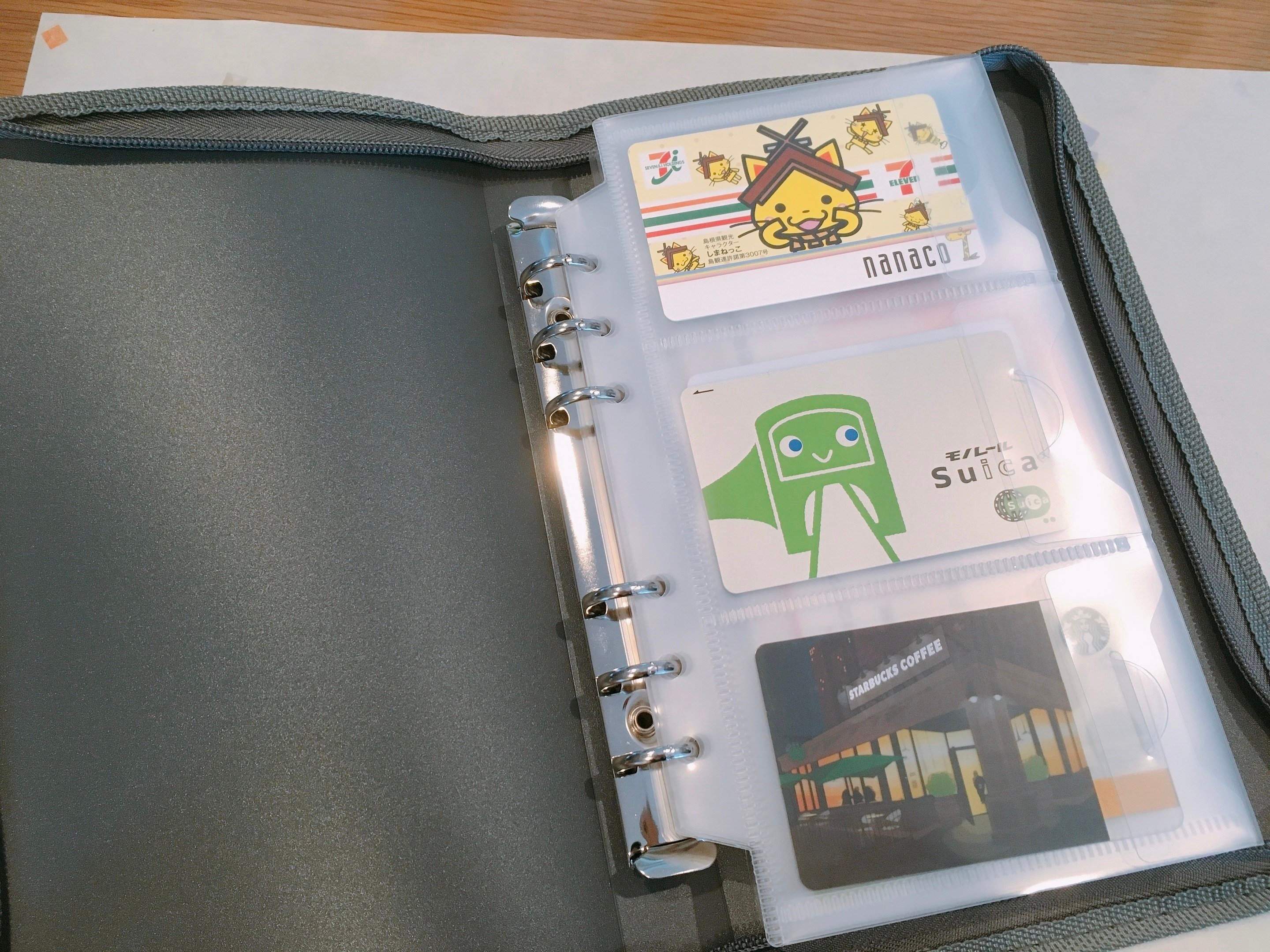 通帳を収納するということは……キャッシュカードもいっしょにしておきたいですよね。「フタ式3段リフィル」ならそれが叶います!(写真は見本としてプリペイドカード類を入れています)