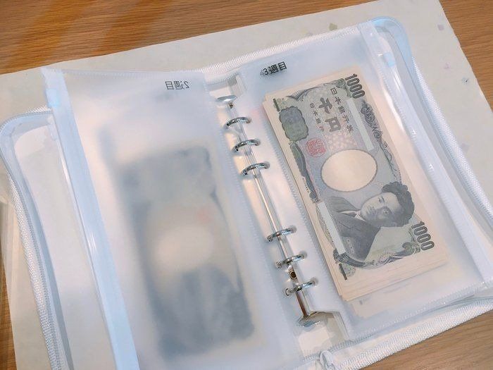 まずはずっとやってみたかったコレ!「ジッパーケースリフィル」に週予算を入れます。わが家の予算は週1万円。週ごとに財布に移して、該当週が終わればまたこちらに戻します。