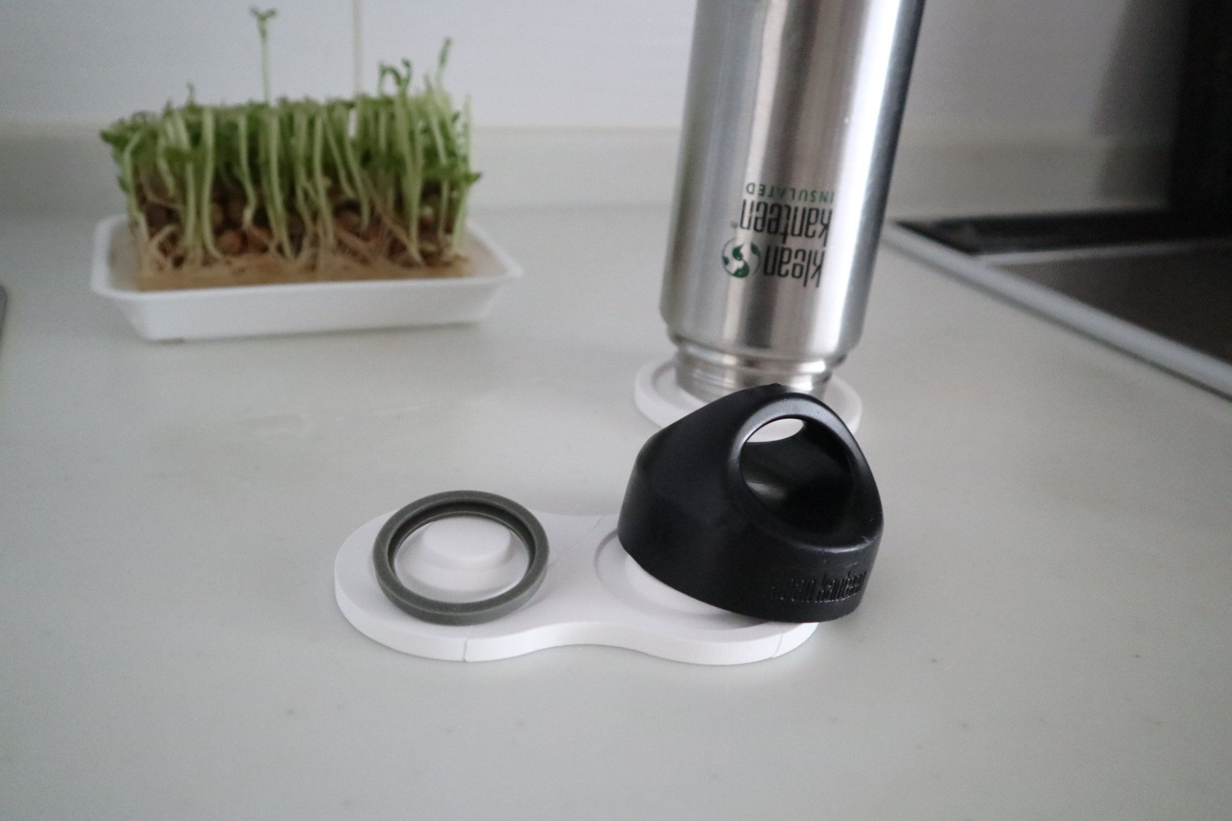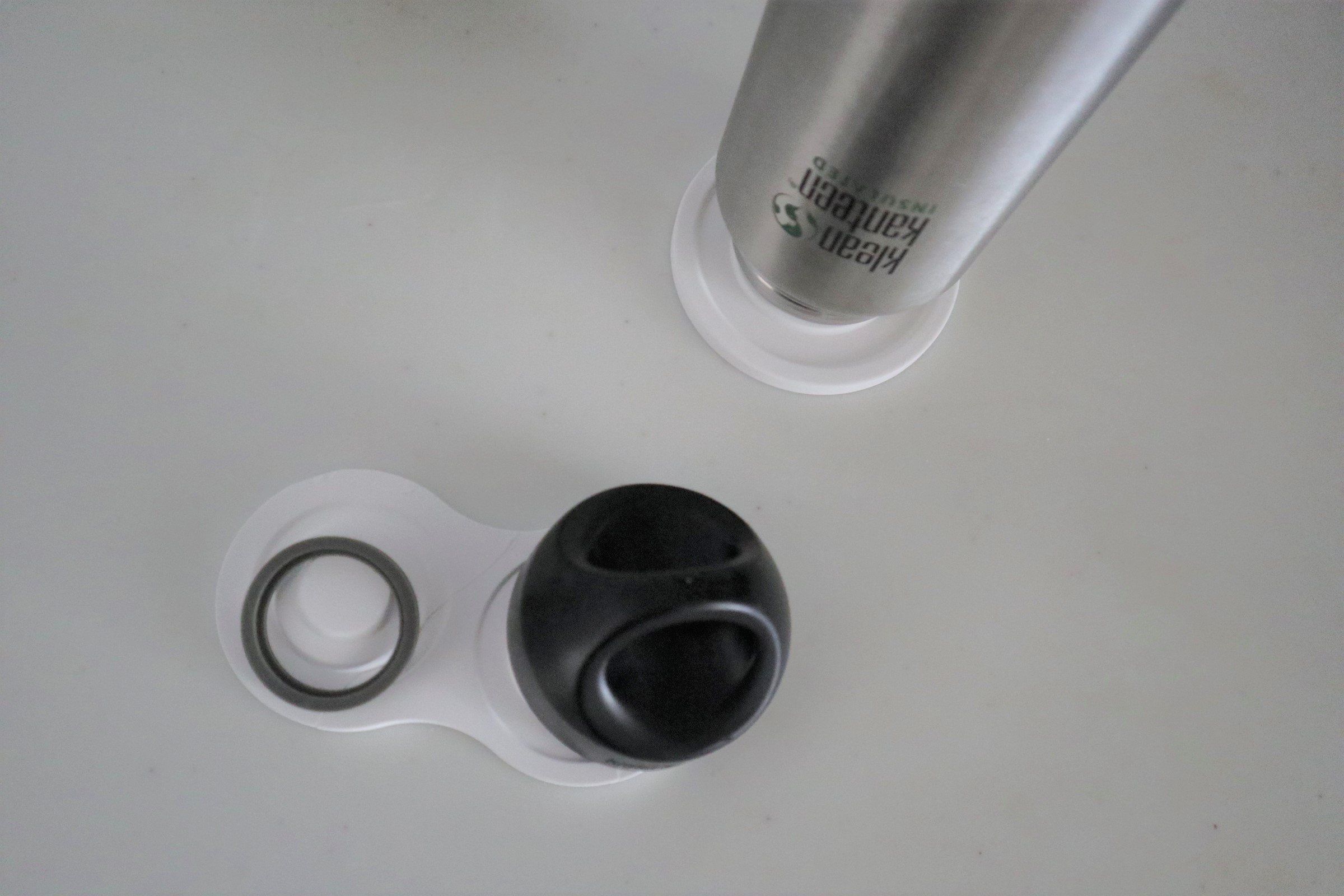 使い方は、写真のように珪藻土の丸い突起部分に、タンブラーや水筒の口を差し込むだけ。蓋などは突起に被せればOKです。突起部分には溝があって、そこに水筒口の縁がハマって安定。高さのあるタンブラーを逆さにおいても倒れることはありません。