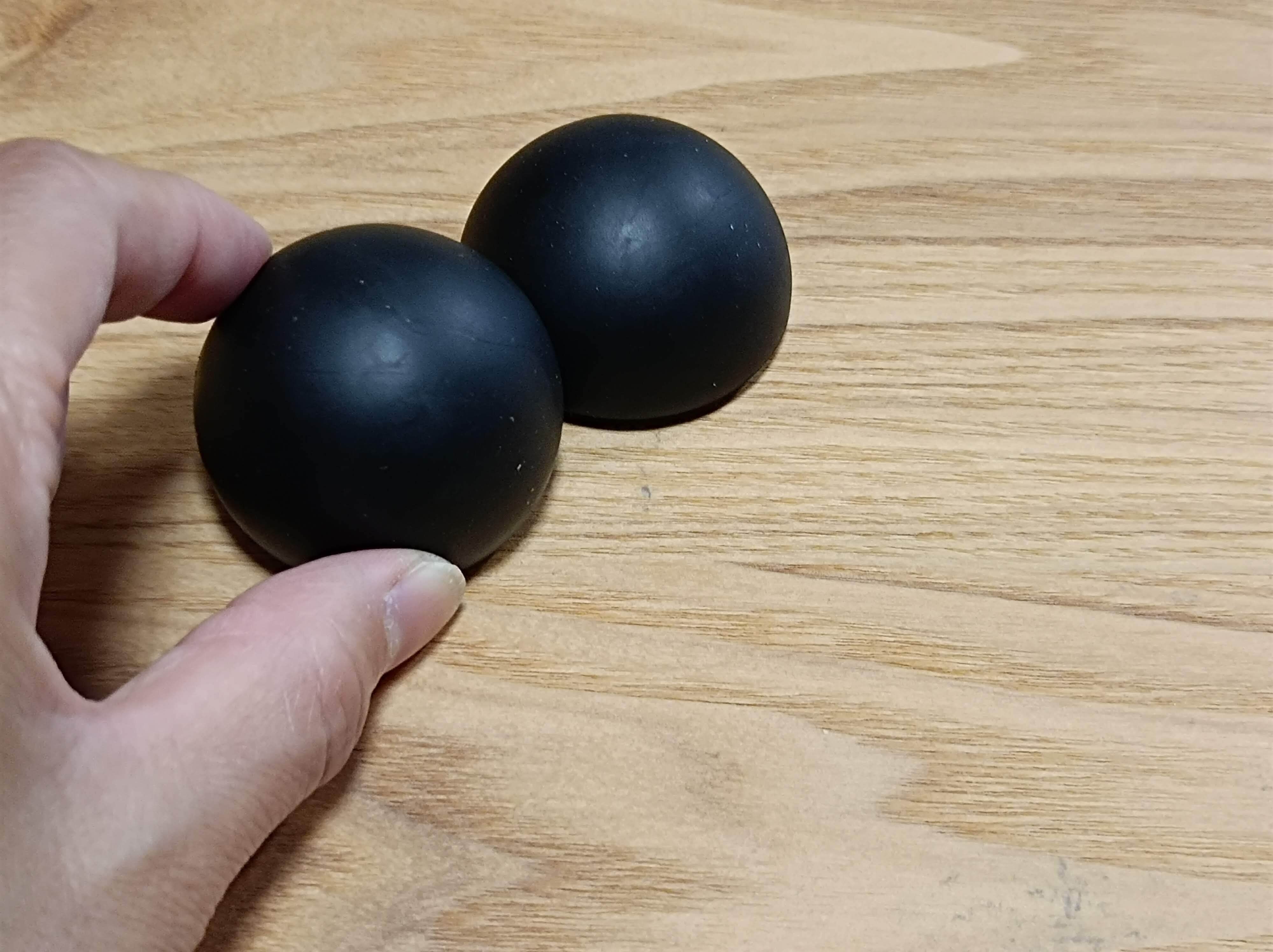 パッケージから取り出してみると、黒い丸い半月ボール。組み合わせると丸いボールになり収納も場所を取りません。では実際にどのように使うのか試してみました。