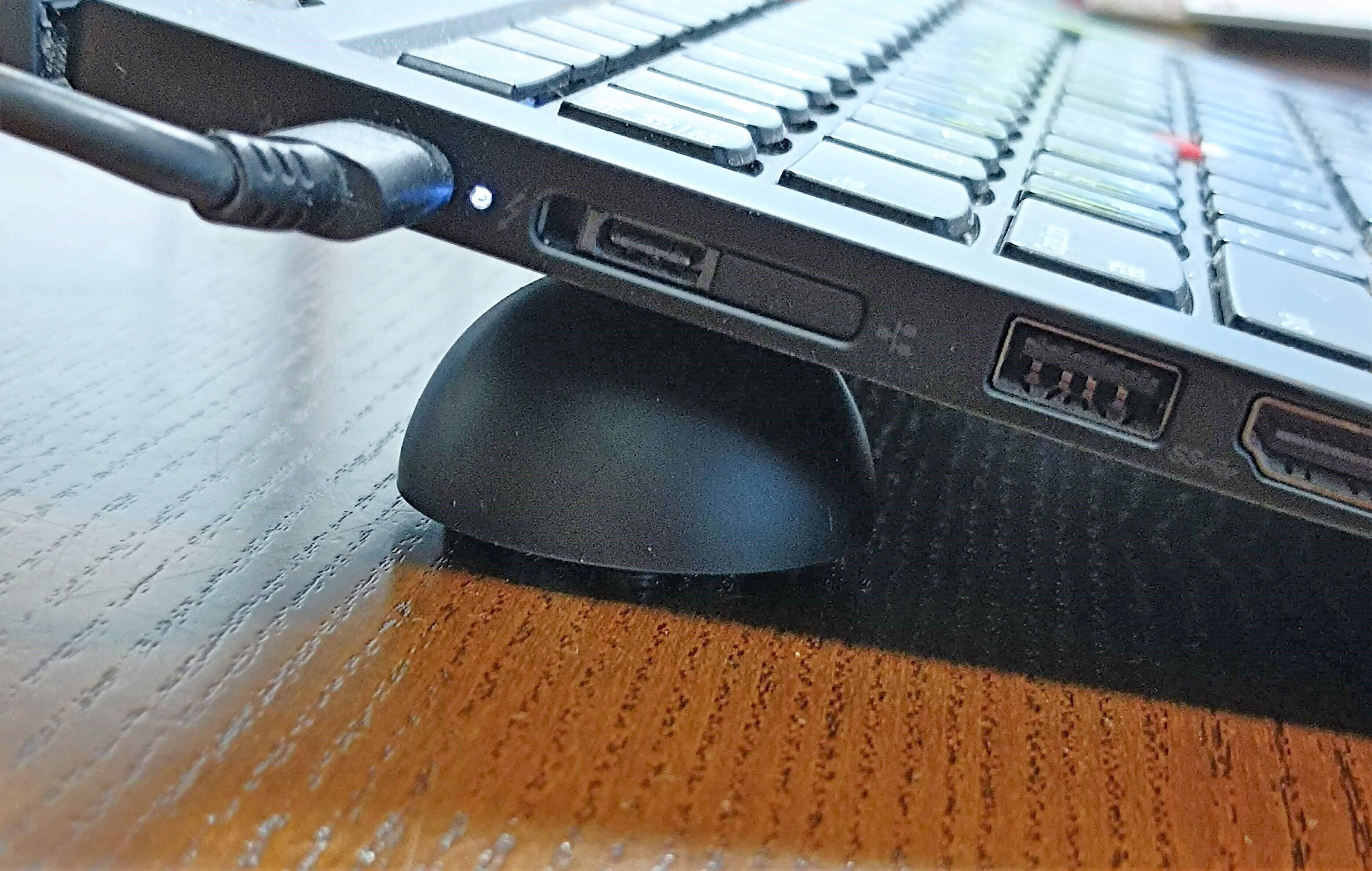 半分に割った状態でパソコンの下に置きます。その際にグラグラしないように安定する場所においてくださいね。