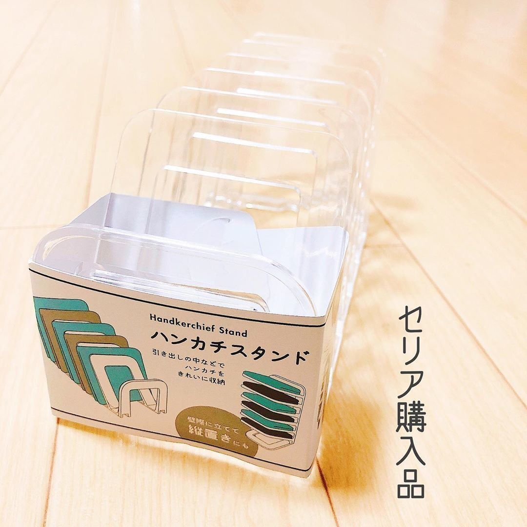 毎日使うハンカチですが、せっかく可愛い柄を買っても重ねてしまうといつも同じものを使いがちに……。セリアの「ハンカチスタンド」は、仕切りがついているので下や奥にあるものも見やすく、取り出しやすくなります。横置きでも縦置きでも使えます。