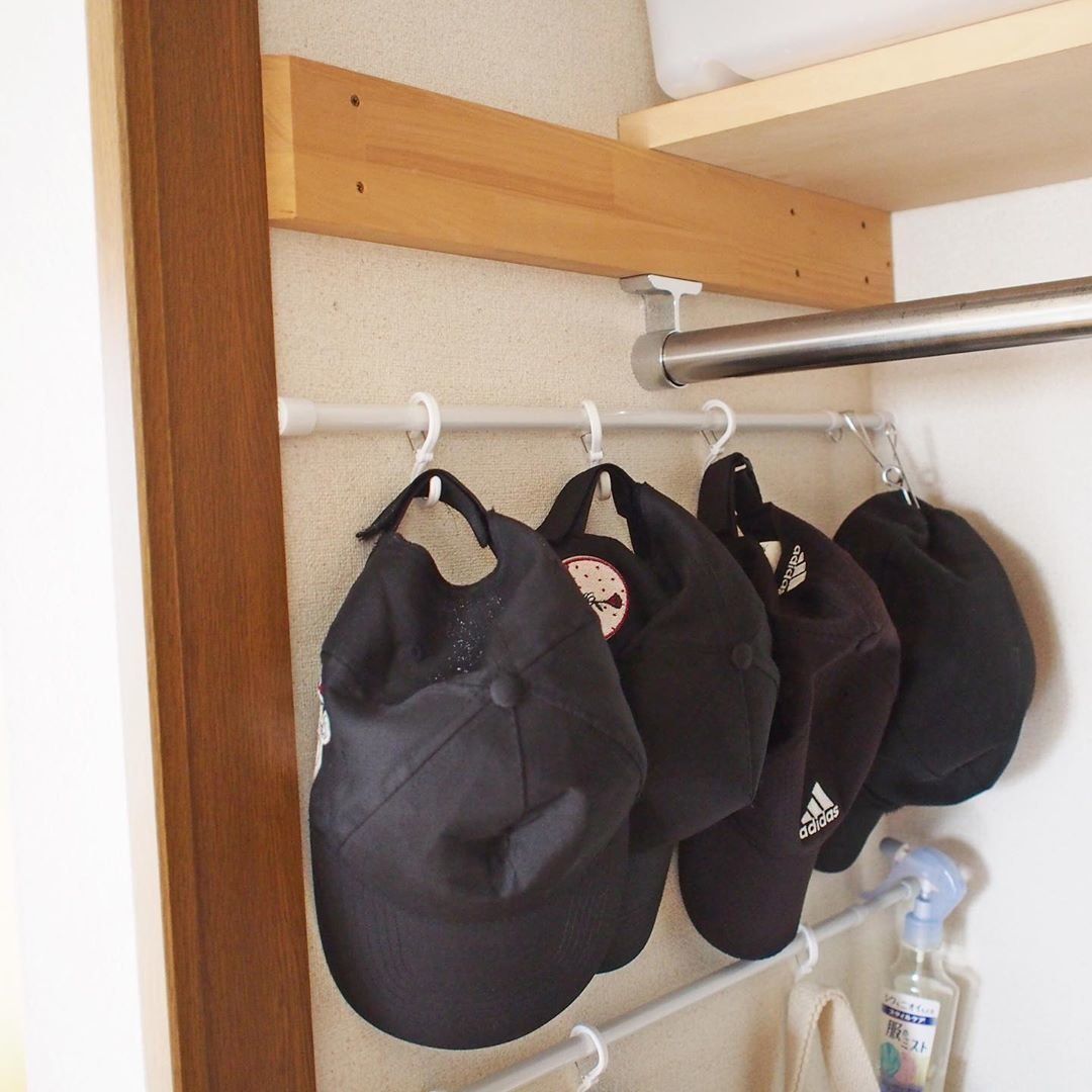 バッグや帽子など小物を吊るして収納するのに便利なS字フックですが、モノを取るときにフックも一緒に外れてしまうことも……。セリアの「ストッパー付きS字フック」ならつっぱり棒から離れないので荷物を取るときもスムーズですね!