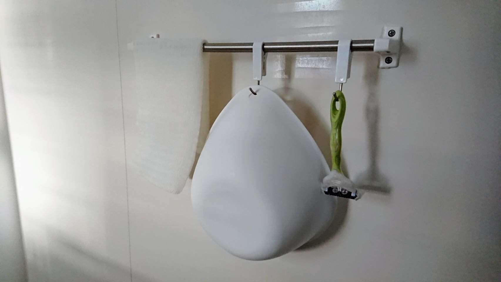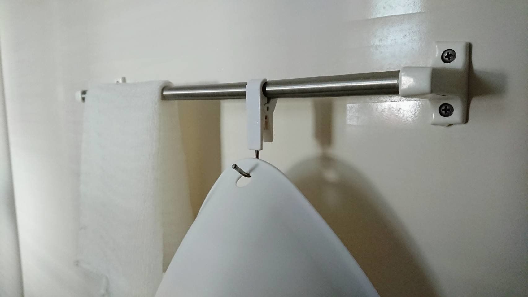 浴室にあるタオルハンガー。ここに丸型クリップで写真のようにはさめば、シェーバーや風呂桶など、散らかりがちなものを「吊るす」収納でスッキリさせられちゃいます。床に置かないので、お風呂お掃除も楽チンになりますね。