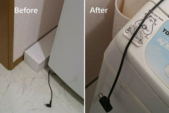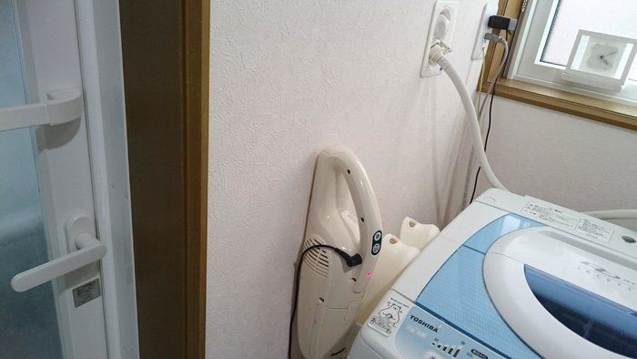 こちらは洗濯機のふたに設置している写真で、掃除機の充電コードを引っ掛けています。