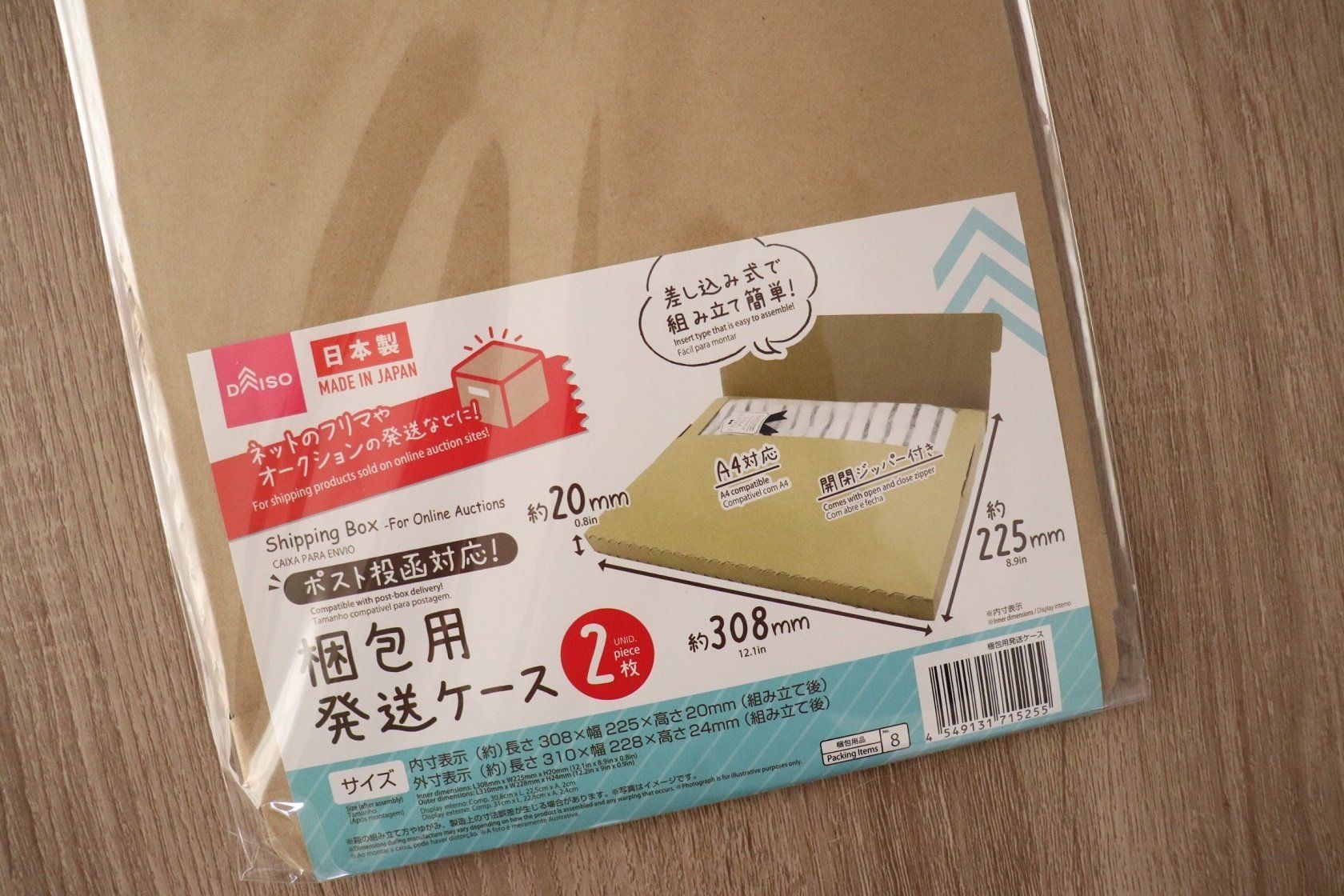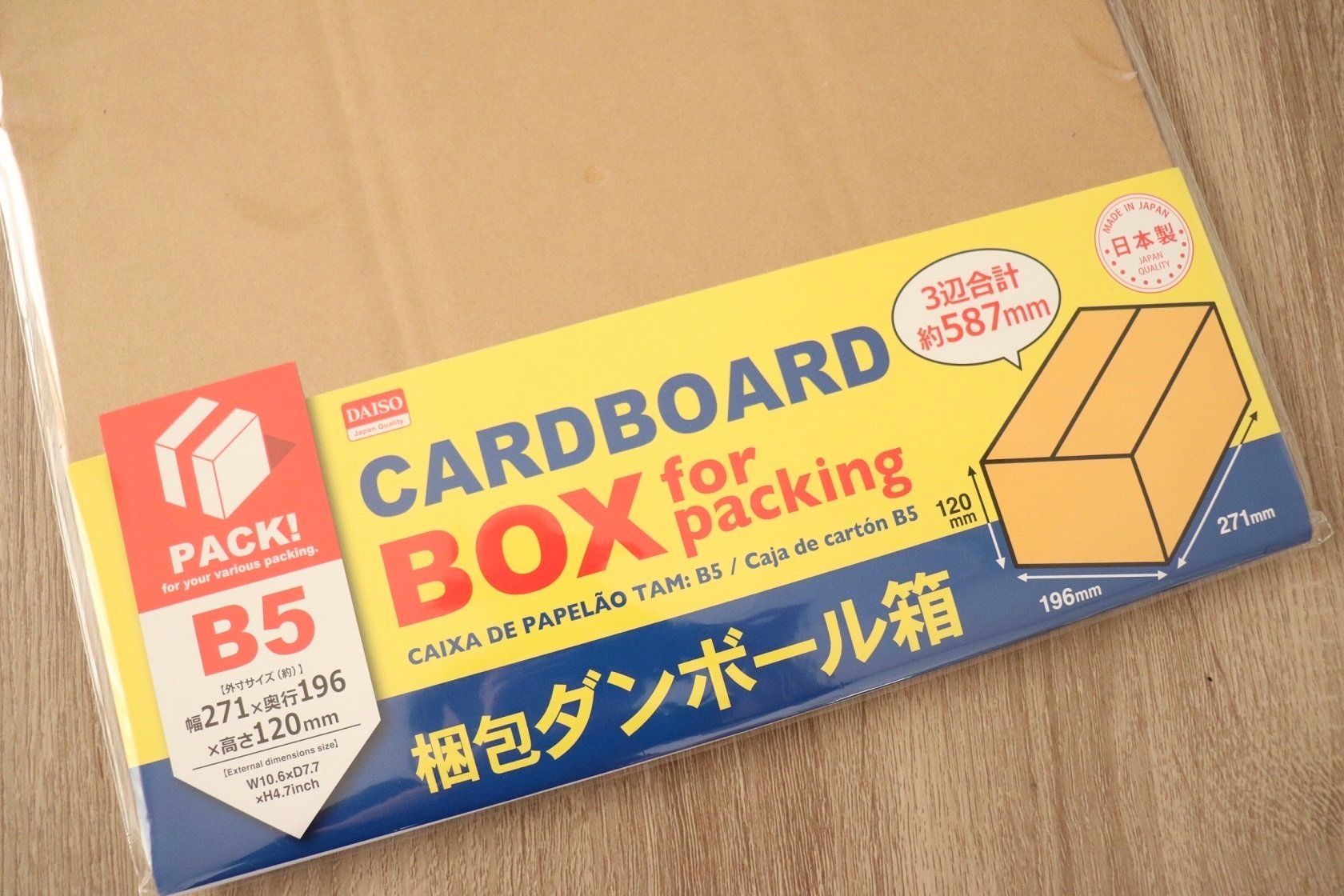 このダイソーの箱は縦、横、高さの合計が58.7cmなので60サイズ!今までは10枚セットからなどしか箱を見つけられなかったのですが最近はダイソーで1枚から買えるように!
