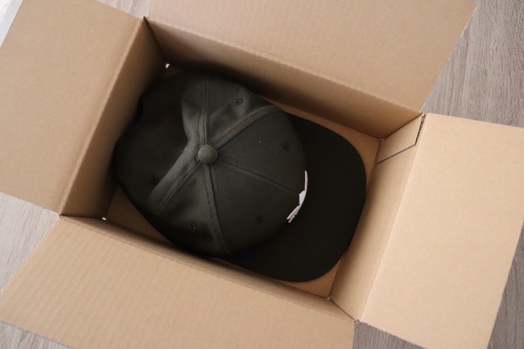 60サイズはみなさんが思っているよりもおそらく小さい箱になるかと思います。筆者はまだ宅配便に慣れていないときに60サイズの箱の小ささに驚愕しました。サイズ感は大人用のキャップがこのようにぴったり入る程度。型崩れさせたくないものや、ハンドメイドのオーダー品などを配送するのに適しています。