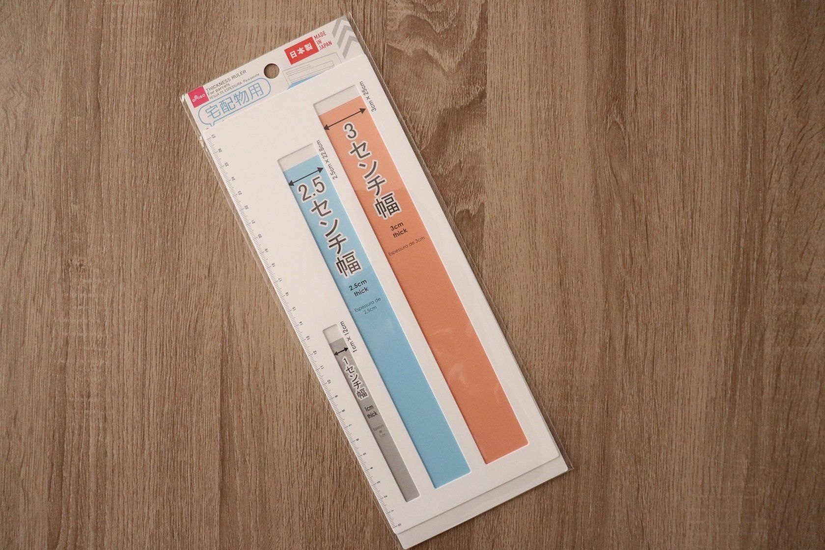 2番目が2.5cm×22.8cm。ネコポスが厚み2.5cmまでなのでネコポスの厚みをはかるのに便利!3番目は3cm×25cm。こちらは厚み3cmまでの荷物が送れるゆうパケットやレターパックなどをはかるのに便利です。