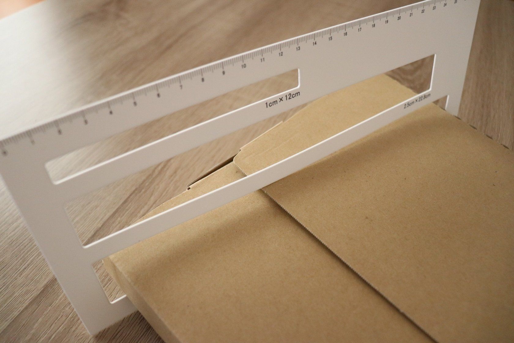 こちらの定規はポスト投函型の荷物を送るときに便利な定規です。1番上が1cm×12cm。定型郵便が1cmまでの厚みが送れるので定型郵便の厚みをはかるときに使います。