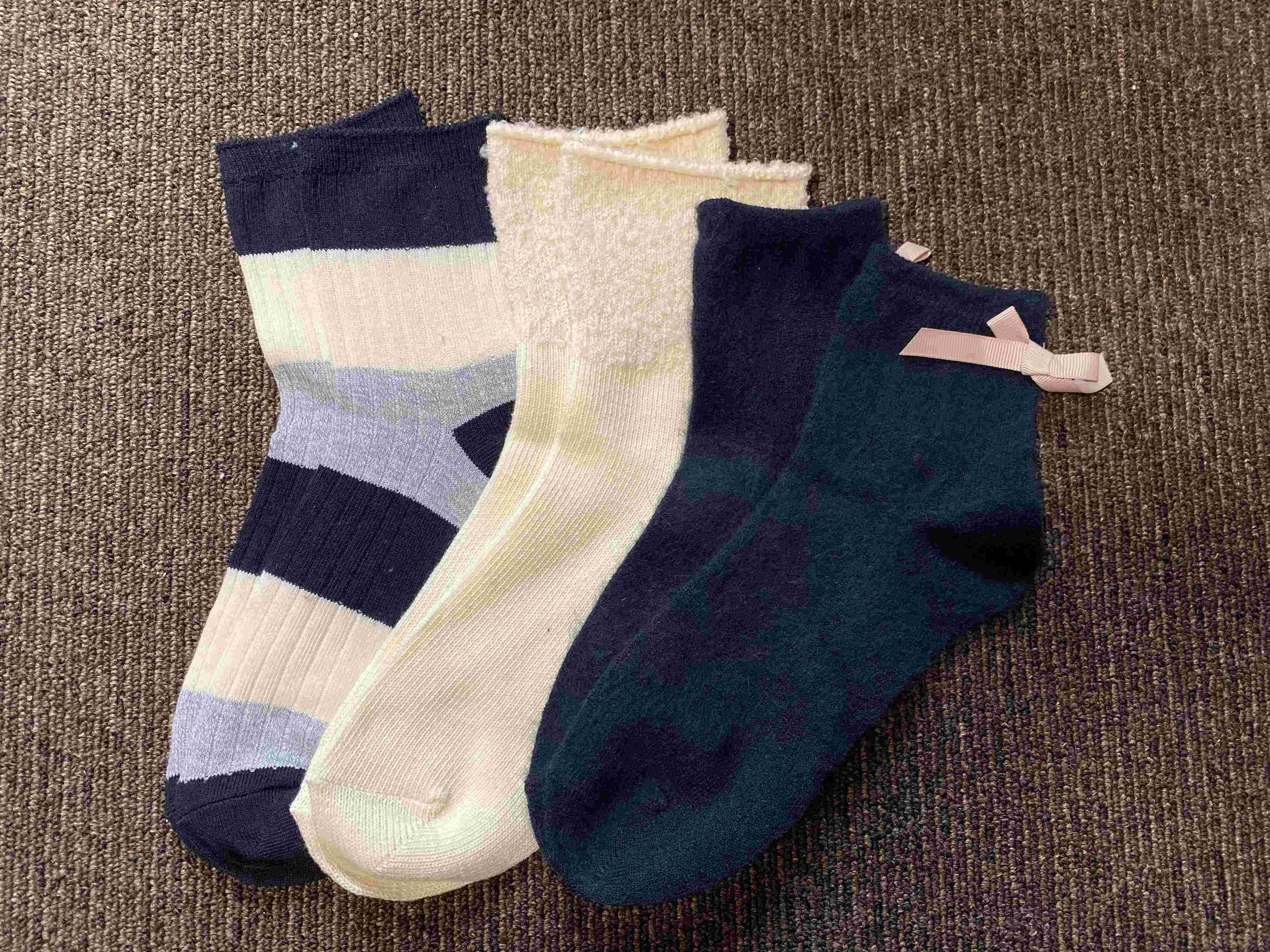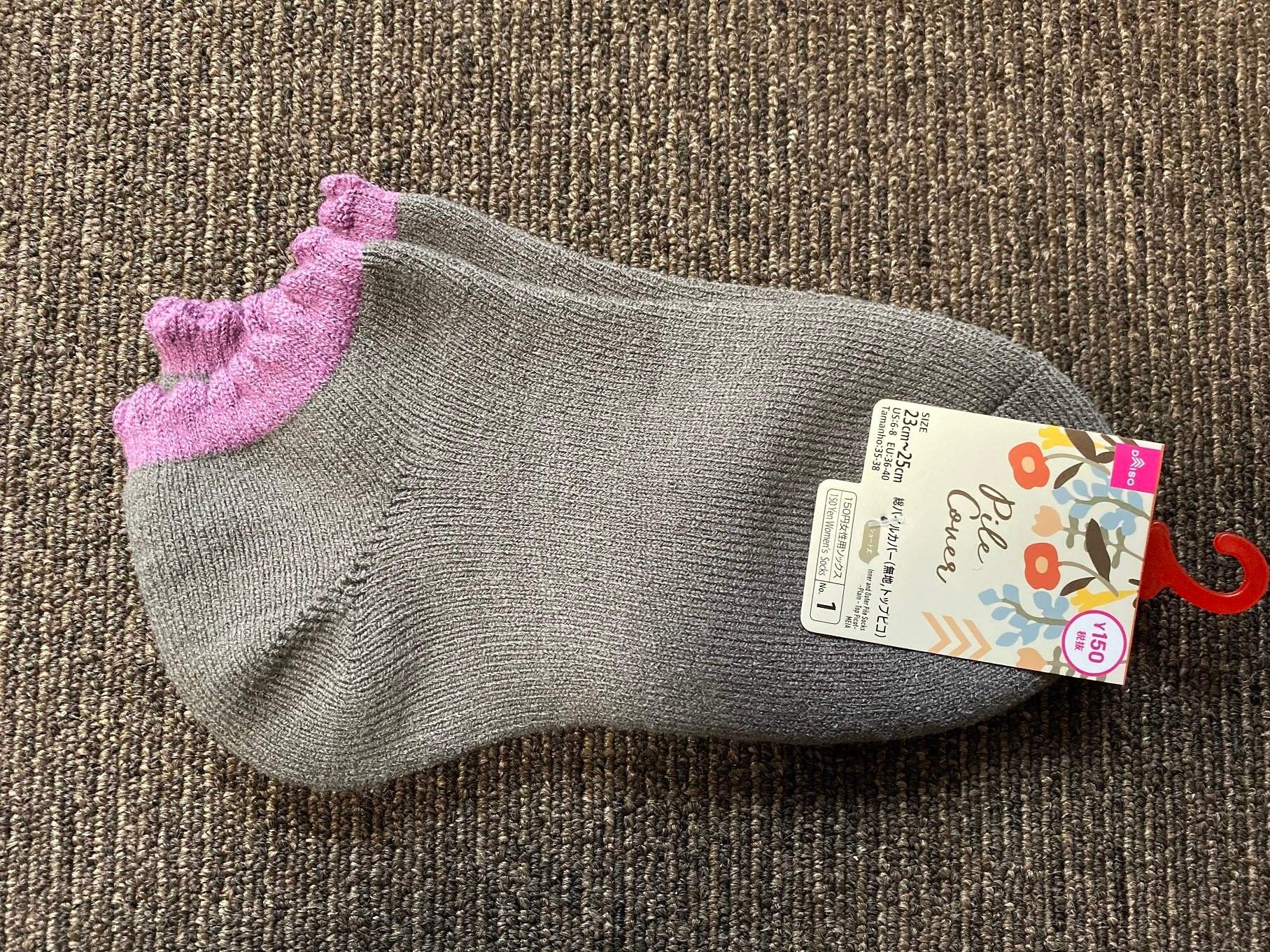 冬にぴったりな、季節感がある靴下もありました。こちらのパイル地の厚手靴下は価格150円。短めですが、履くとふわふわの感触で家の中で履くのにいい感じですよ。