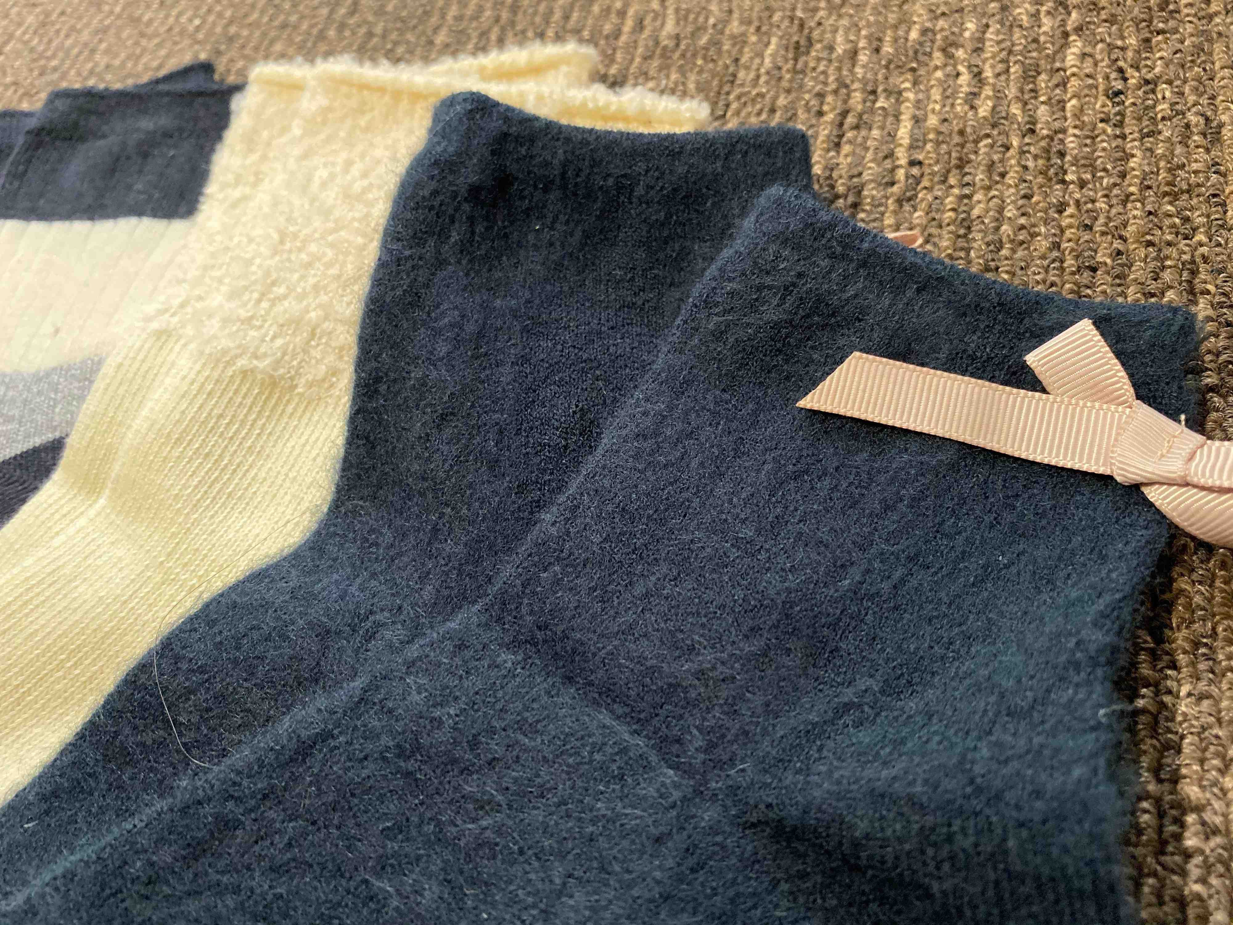 基本的には綿素材やアクリル素材で厚手ではないですが、ウール混のものもありました。私が選んだものは一部がウール混のもの。シンプルですが、よく見ると切り替えデザインだったり、リボンつきだったりと、100円とは思えぬクオリティー!色バリエーションもそれぞれ2、3色ずつありましたよ。
