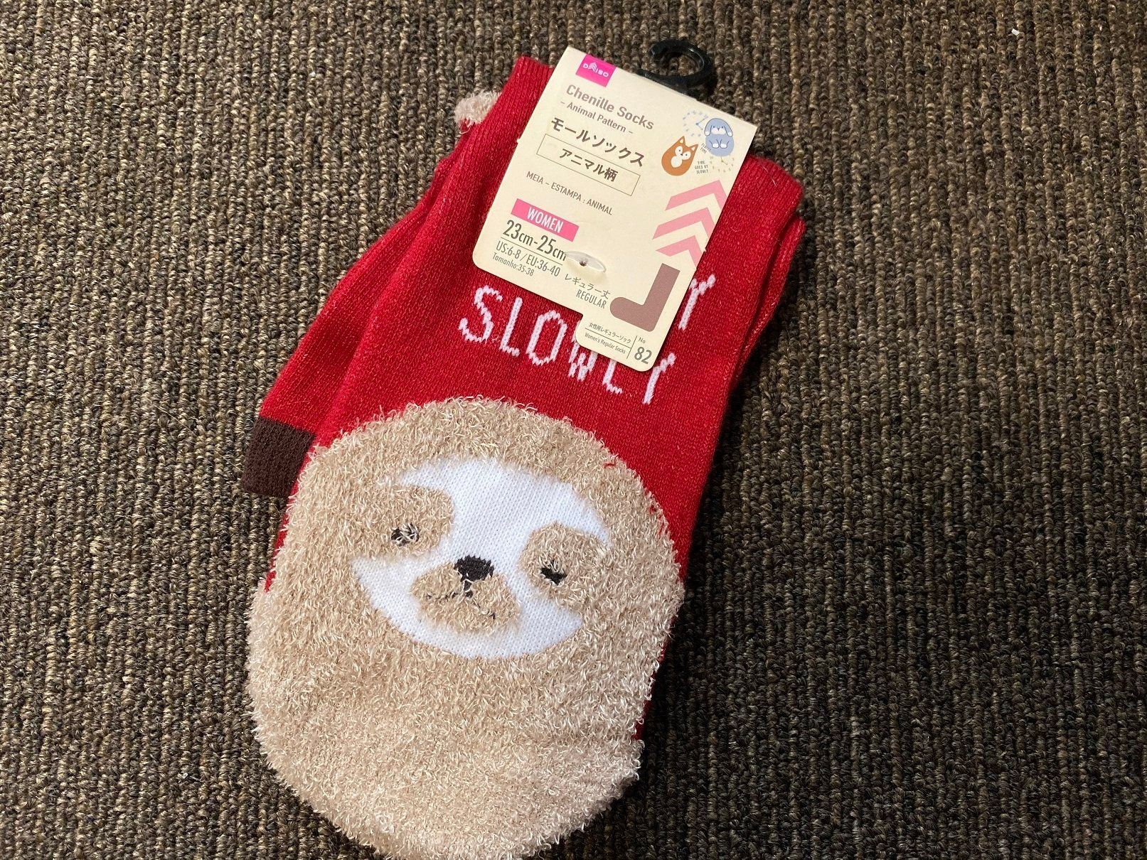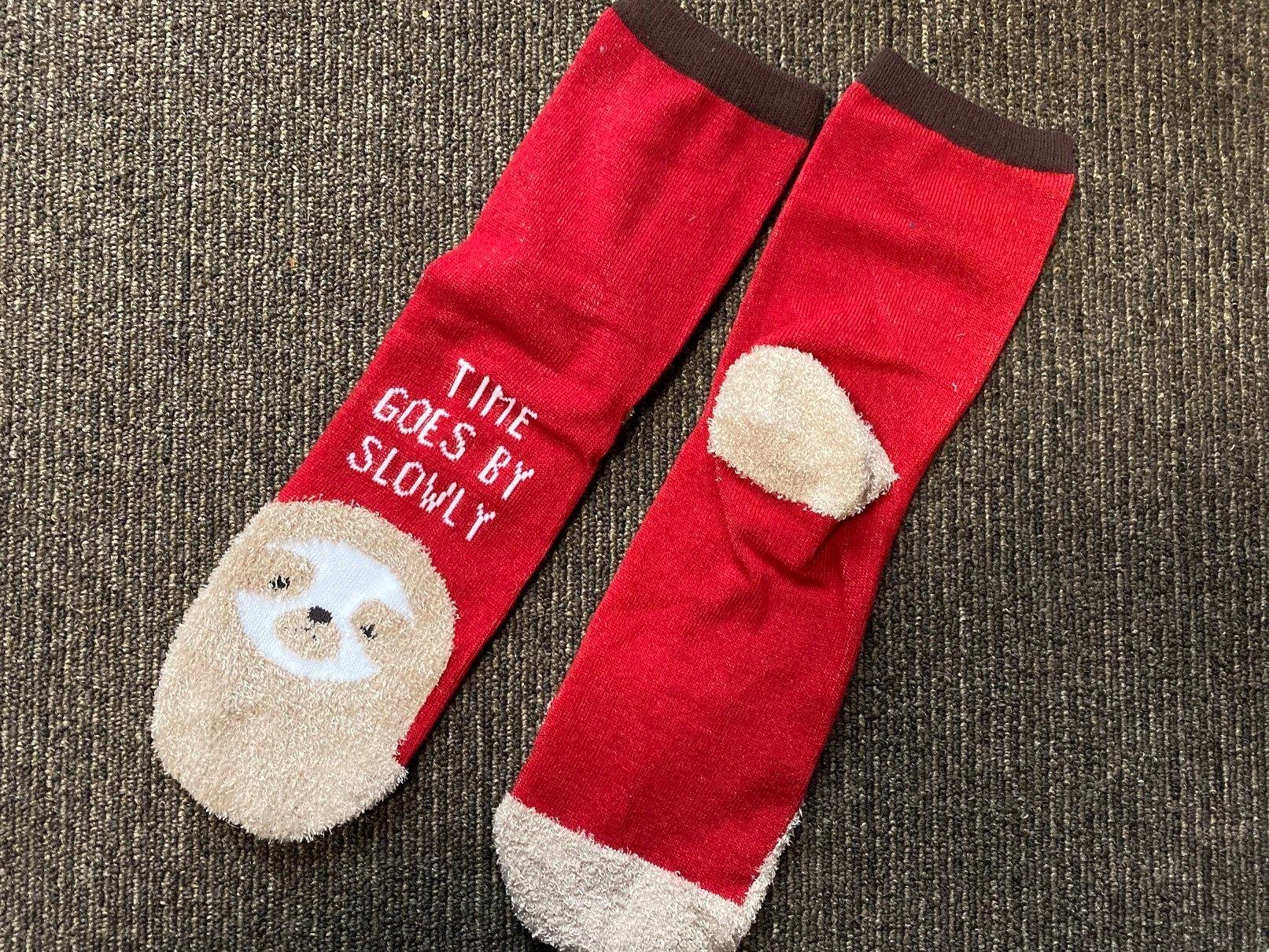 こちらも最初と同じくクルーソックスですが、ちょっと長めでレギュラー丈の表示があります。価格は100円。アニマル柄が多い靴下のなかでも、このナマケモノ柄がとくにかわいかったです。ただ、大人が履くのは恥ずかしいので、小学生の子どもにあげました。
