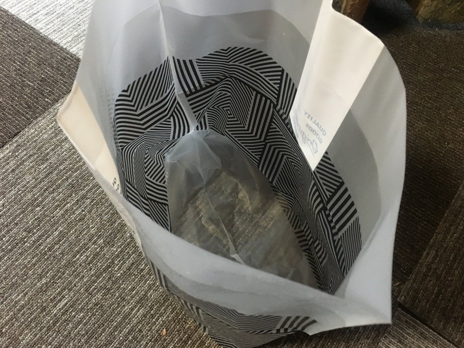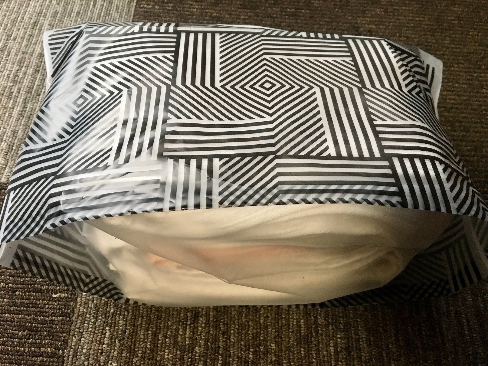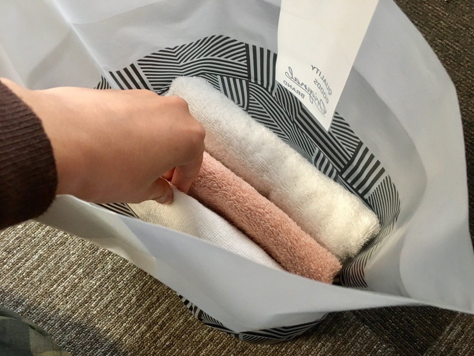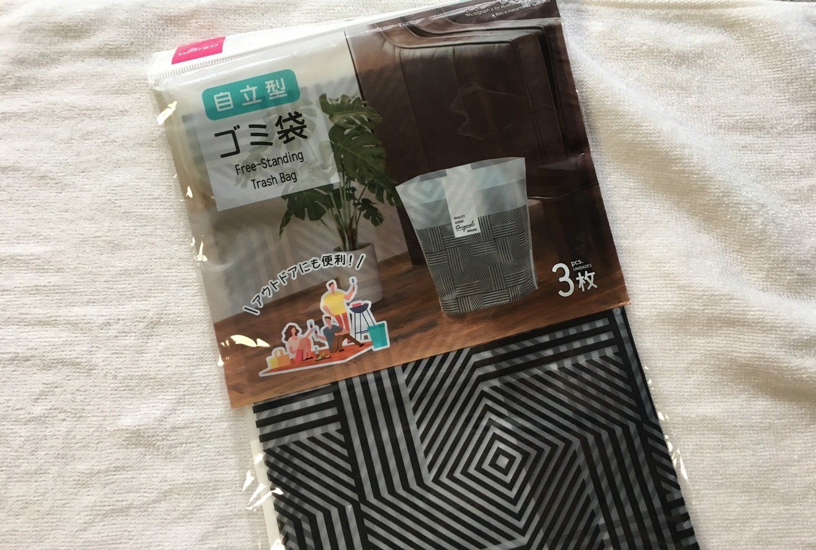 このゴミ袋、ご覧のとおりデザインもゴミ袋っぽくありません。モノトーンのおしゃれな柄なので、収納グッズとして使うのもおすすめ。たとえばタオルをいれてみるとか。実際にやってみたところ、畳んだ状態のフェイスタオルが3枚入りました。