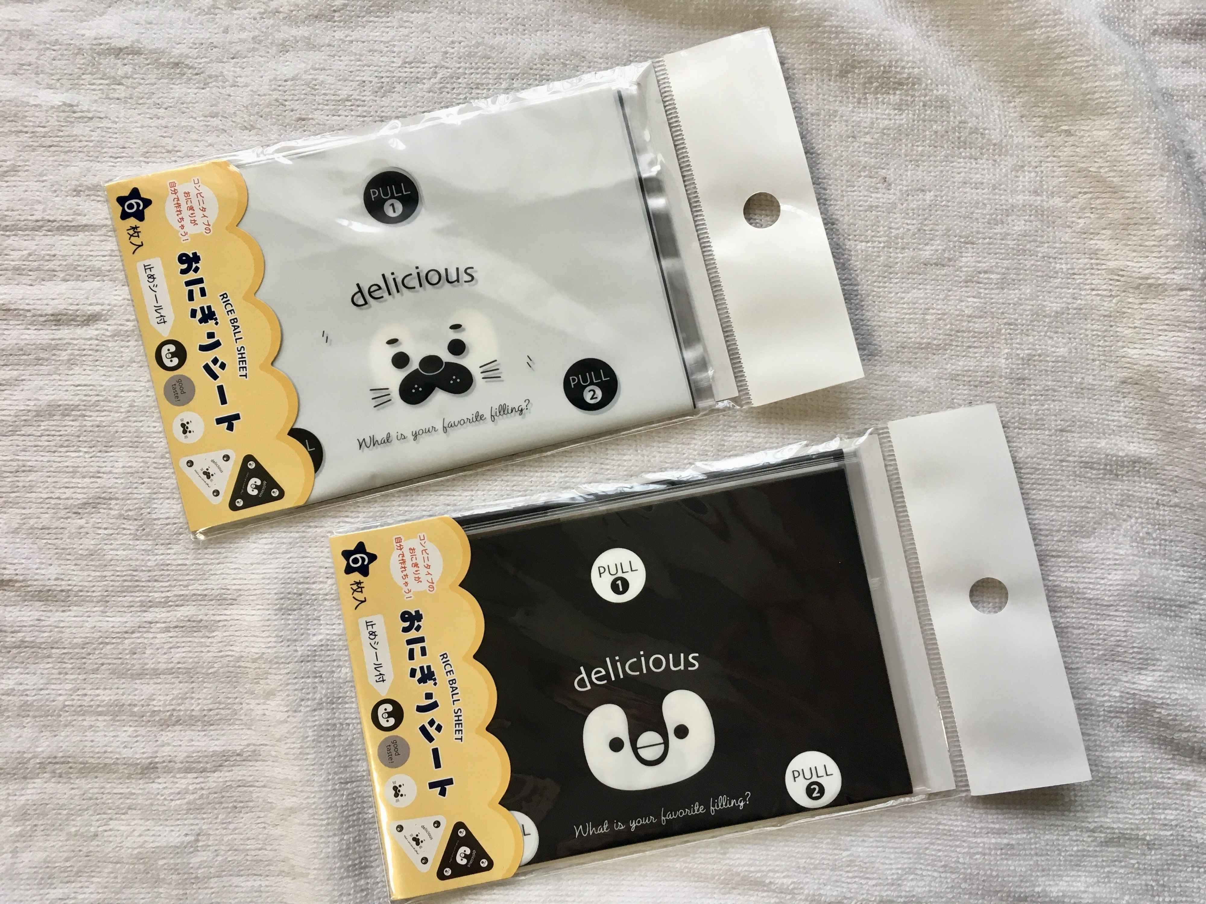 今回紹介するのはセリアで購入した「おにぎりシート」。アザラシがモチーフの白を基調としたデザインと、ペンギンがモチーフの黒を基調したデザイン2種類があったので、両方を購入。1パッケージにつき、3枚のシートが入っていて、価格は100円です。
