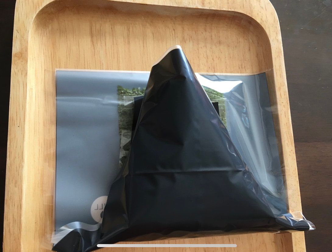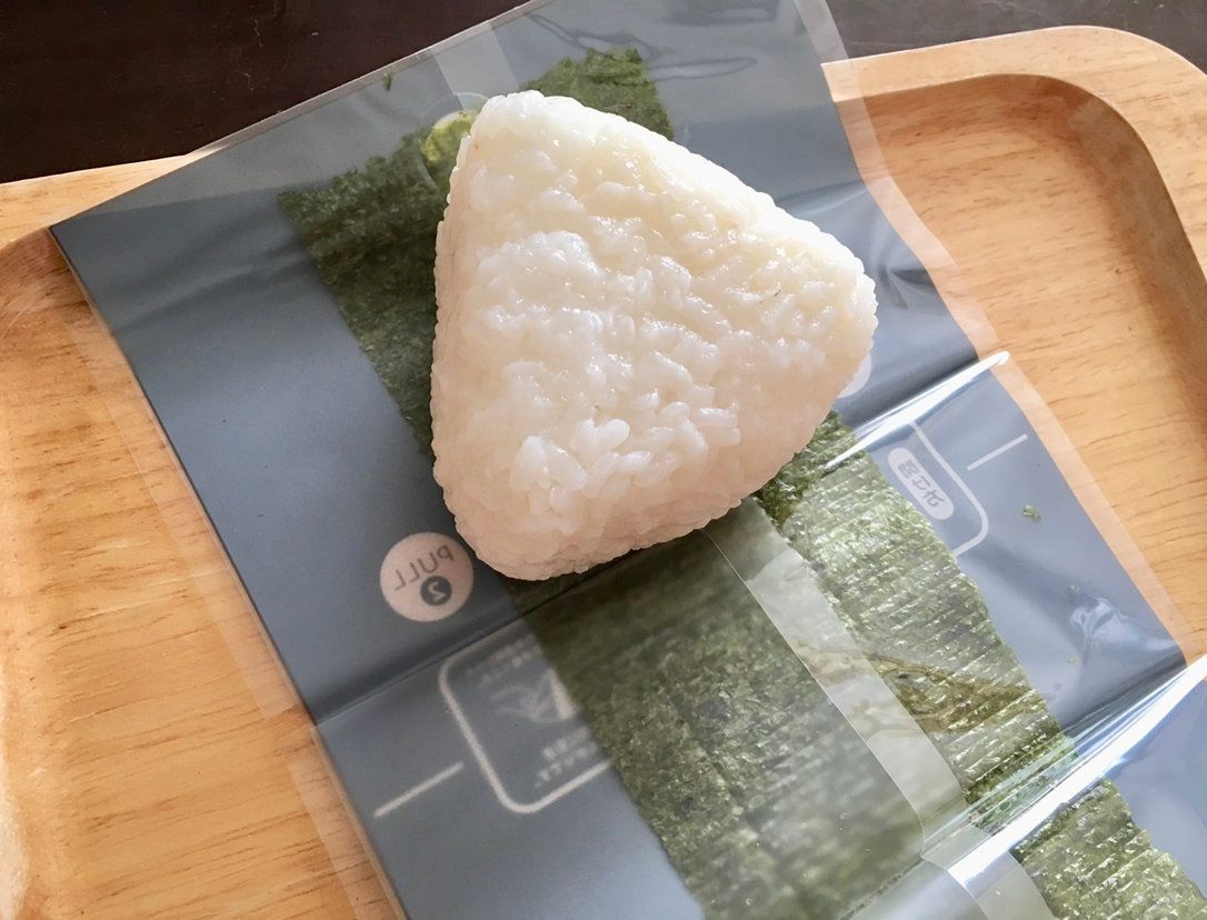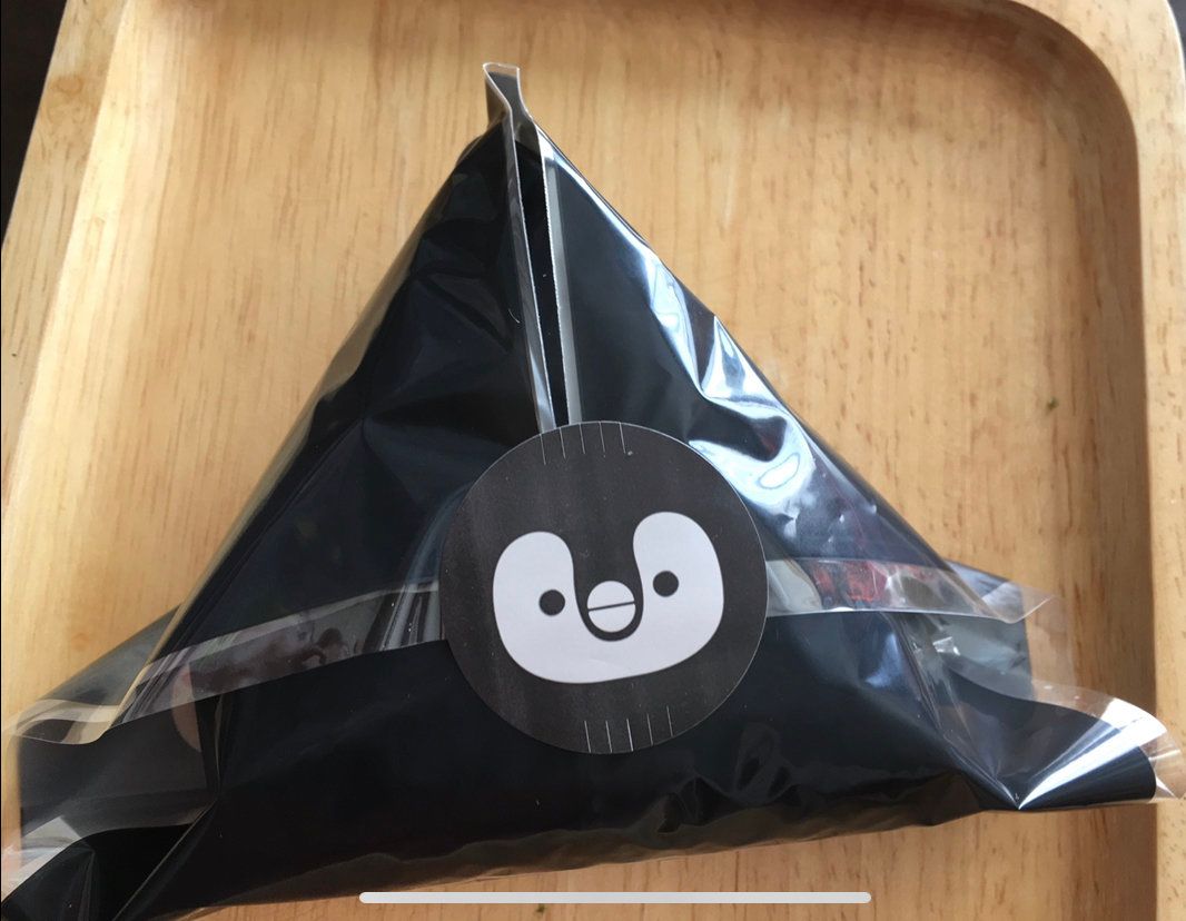 ちゃんと位置を確認したら、裏側からおにぎりの三角に沿ってシートで包み、前側の角を後ろにもってくれば、ほぼ完成。