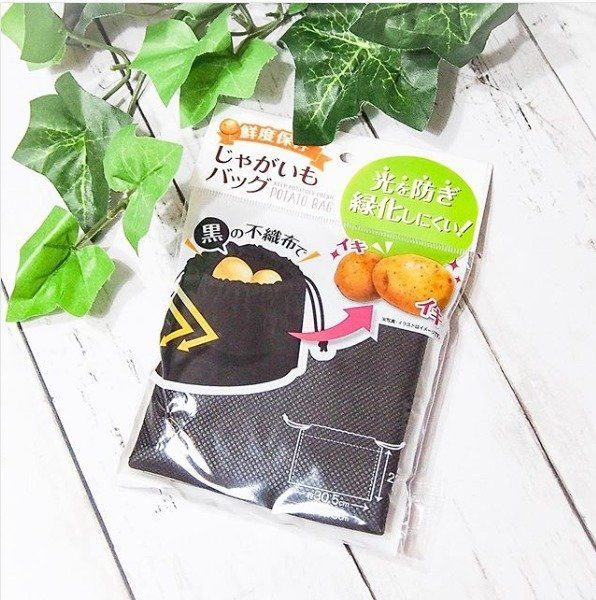 置きっぱなしのじゃがいもは気がついたら緑化したり芽が生えたり保存に困りがち。そんな悩みを解決するのがこちらのじゃがいもバッグです。黒色の不織布なので光を通さず、空気は通してくれるのでじゃがいもを保管するのにいい環境をつくってくれます。