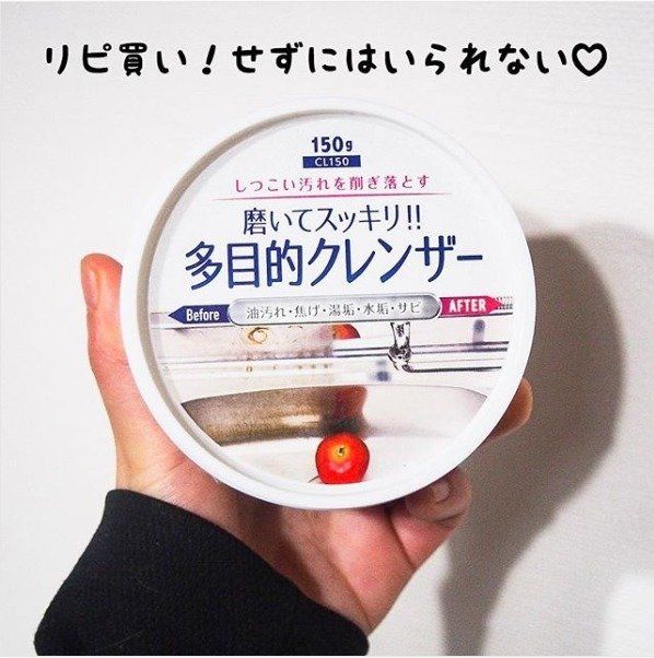 こちらの多目的クレンザーは100均掃除アイテムのなかでもとくに大人気で、リピ買い続出のアイテムとなっています。キッチンからお風呂場まで使い道もたくさんで、落としにくい汚れもこのクレンザーで優しくこするだけで新品のようにきれいになります。