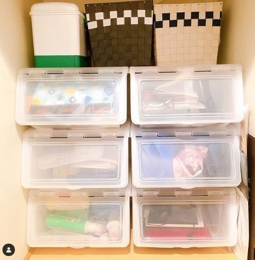 PPバッグのほかにも、ダイソーには半透明のプラスチックやバスケットタイプの収納ボックスなど、さまざまな種類があります。半透明のボックスは中が見えるので、何が入っているか一目でわかってとても便利。
