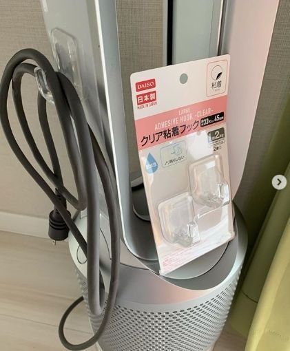 こちらは収納ボックスではありませんが、持っているといろいろ活用できる「クリア粘着フック」。空気清浄機や扇風機に貼ればコードをクルクル巻きつけて収納でき、床のお掃除も楽ちんになります。