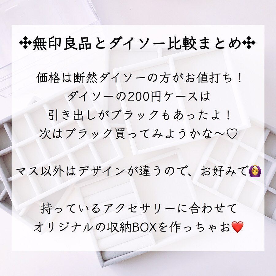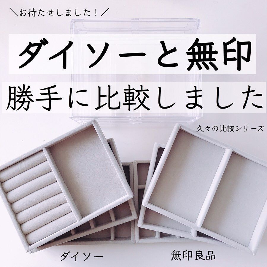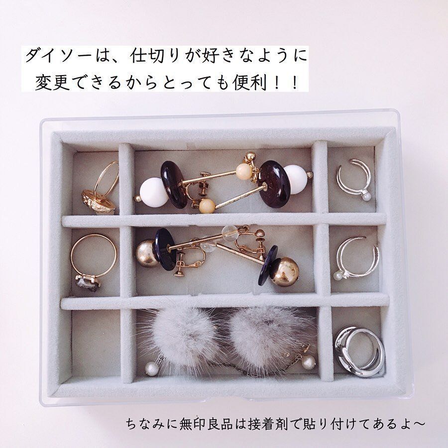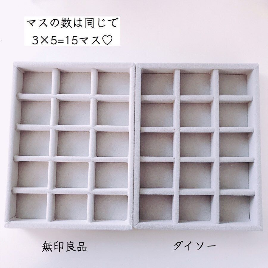 ダイソーも無印良品もアクリルケース本体を購入後、さまざまな仕切りの専用のベロア内箱を好きなようにカスタムして使います。内箱も似たような仕切りのタイプが販売されているんです。